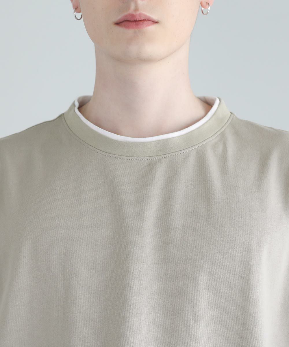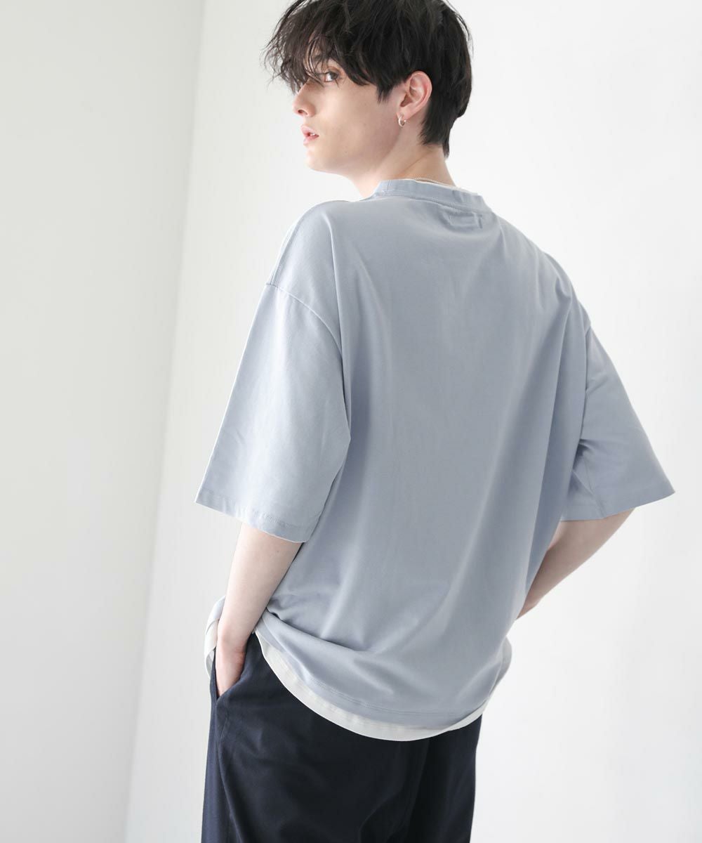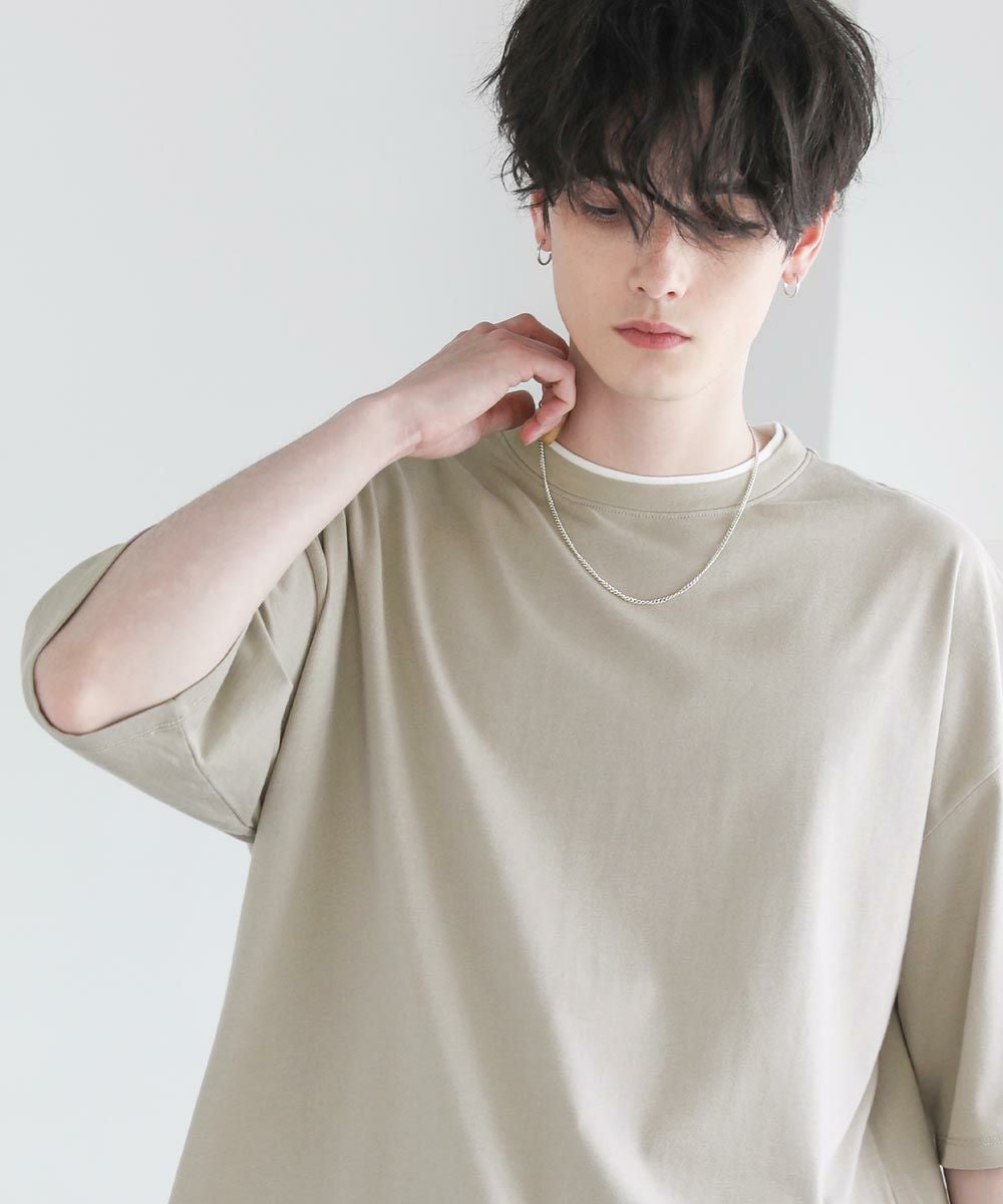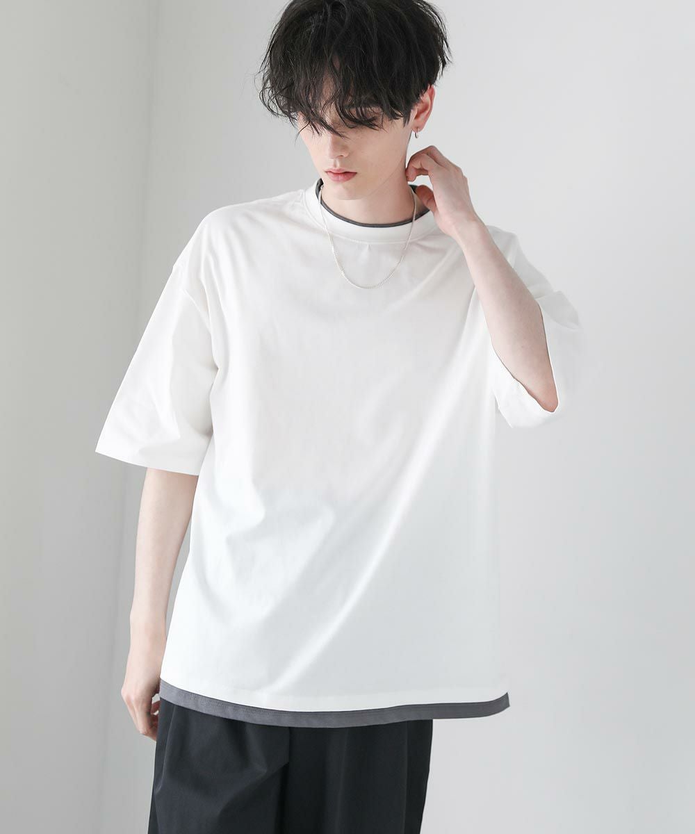 程よいゆとりをもたせたリラックスシルエットの半袖Tシャツ。襟、裾の2か所からインナーがチラッと見えているようなフェイクレイヤード仕様になっており、シンプルながら存在感のある1枚です。