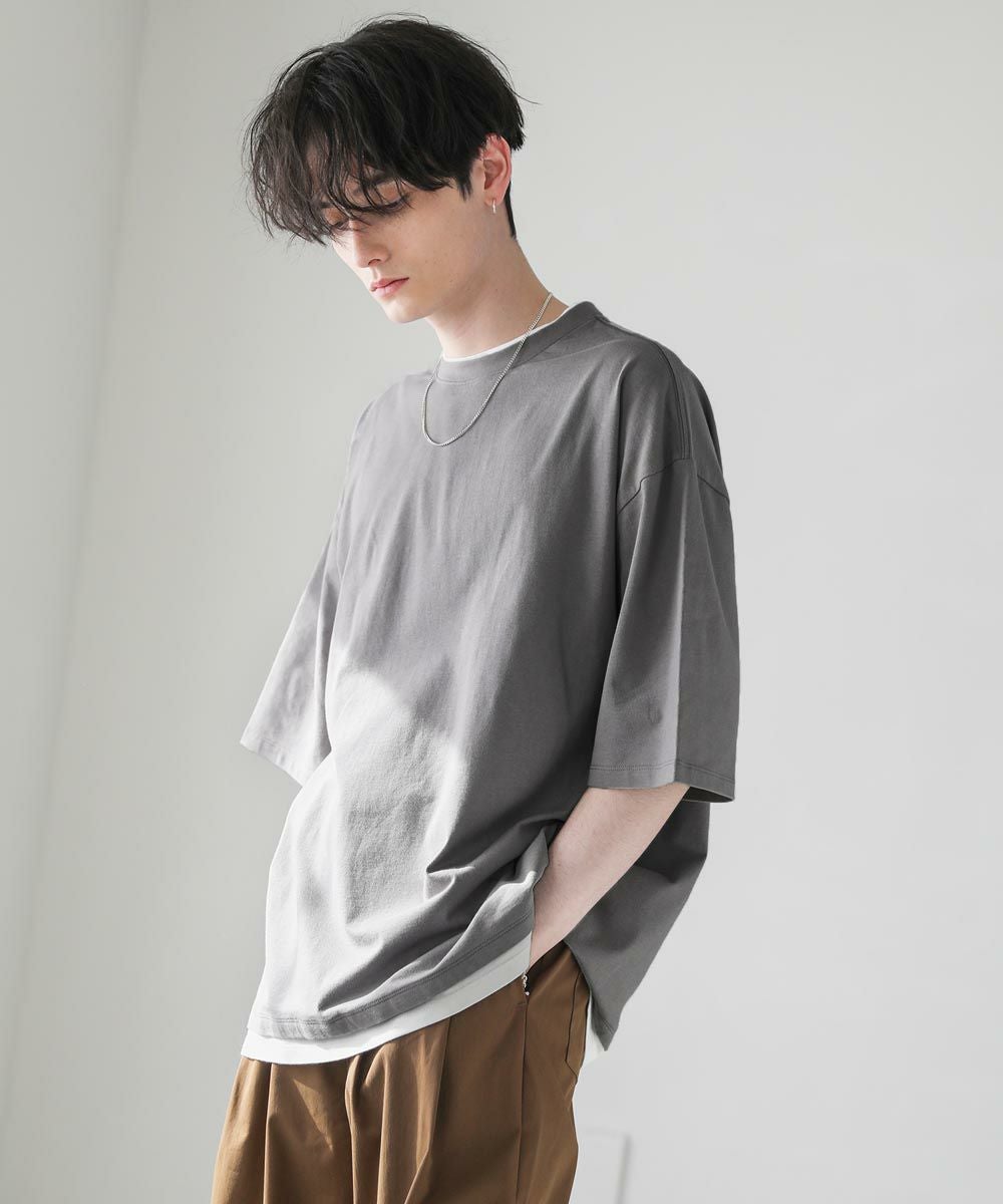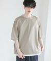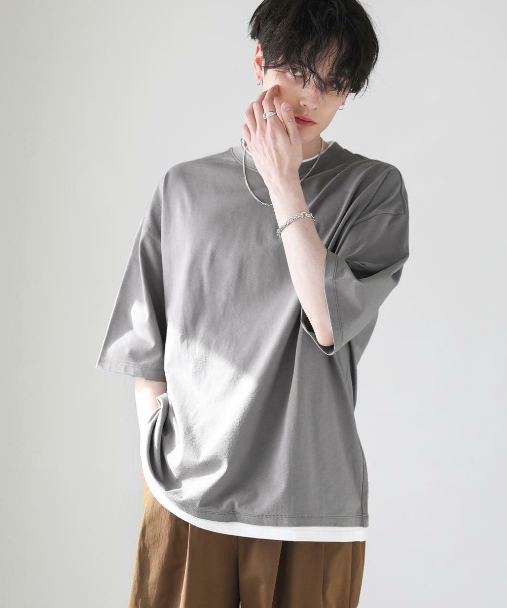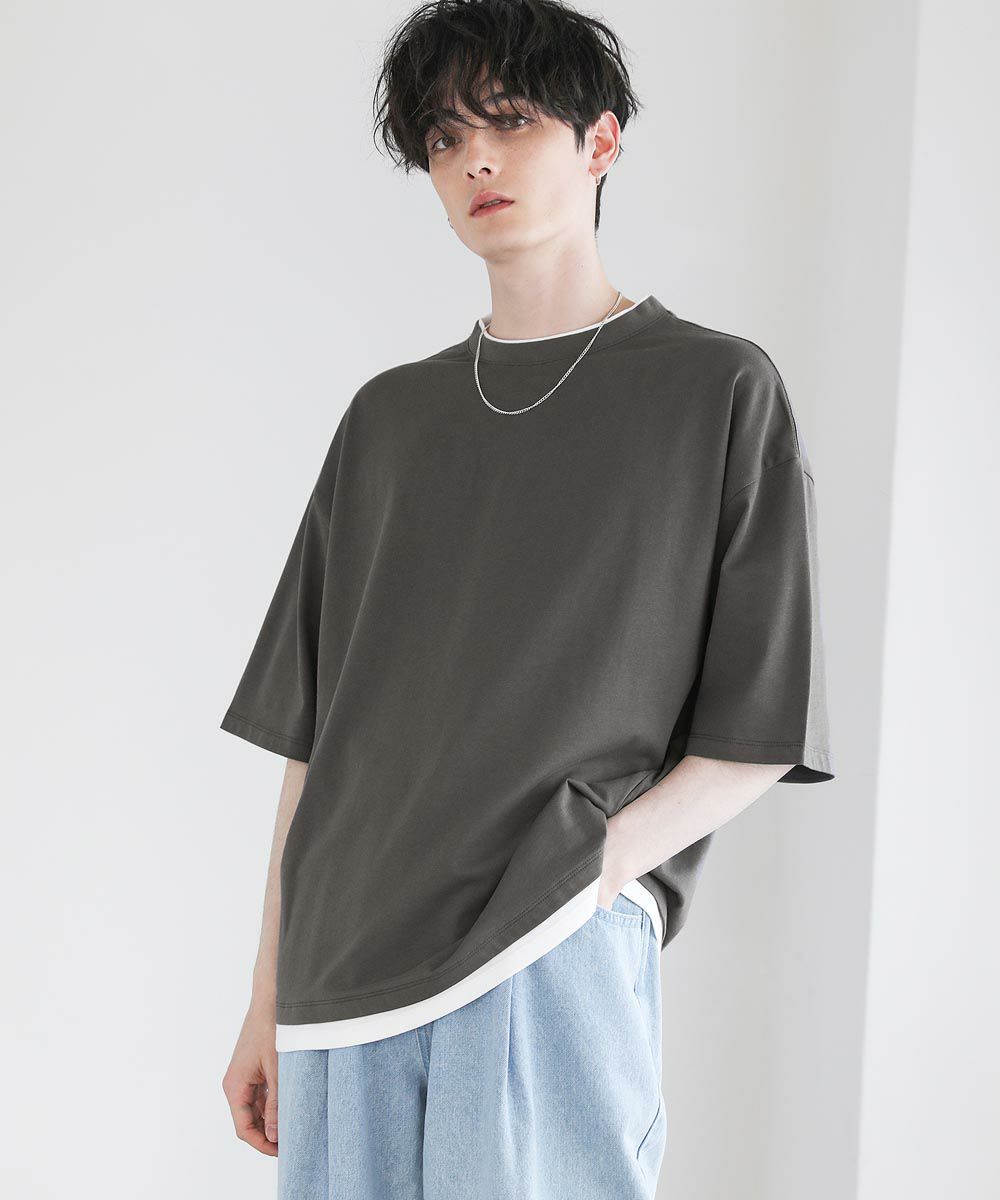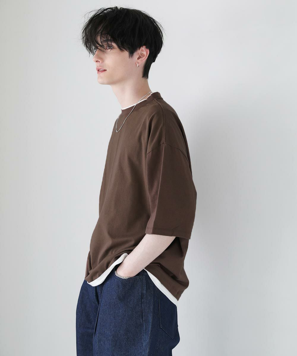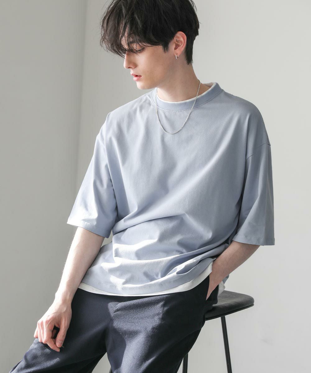 程よいゆとりをもたせたリラックスシルエットの半袖Tシャツ。襟、裾の2か所からインナーがチラッと見えているようなフェイクレイヤード仕様になっており、シンプルながら存在感のある1枚です。