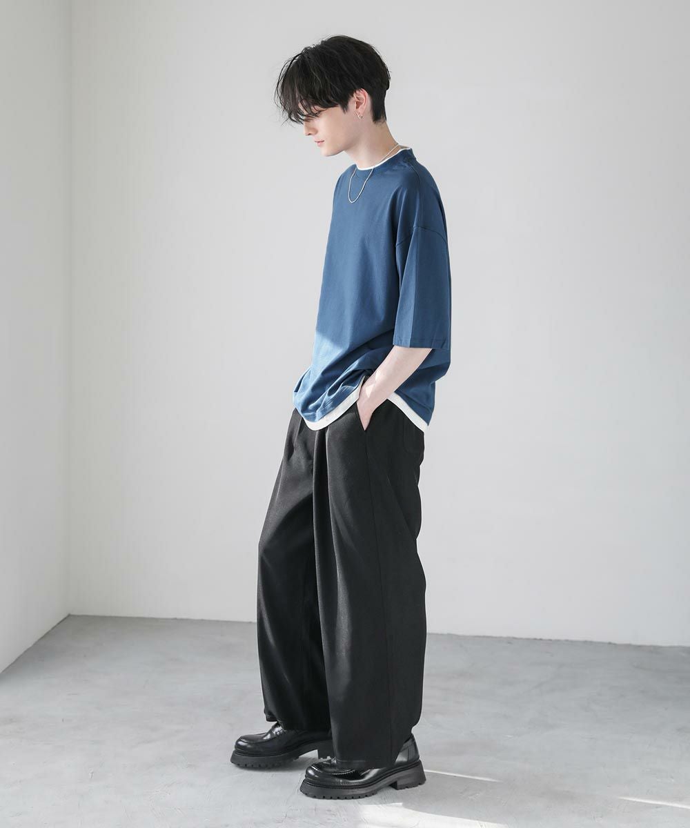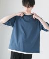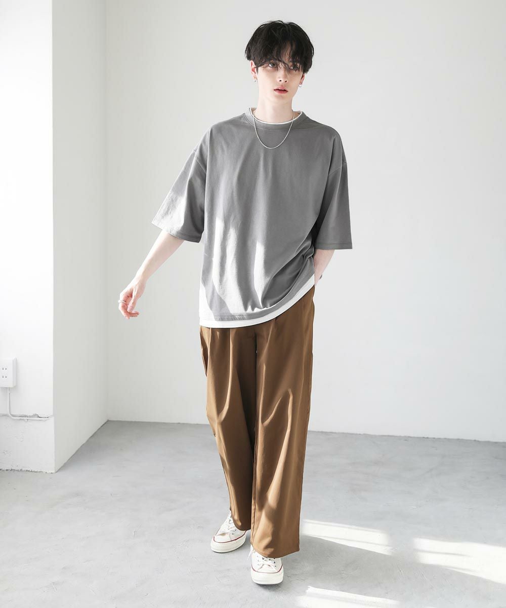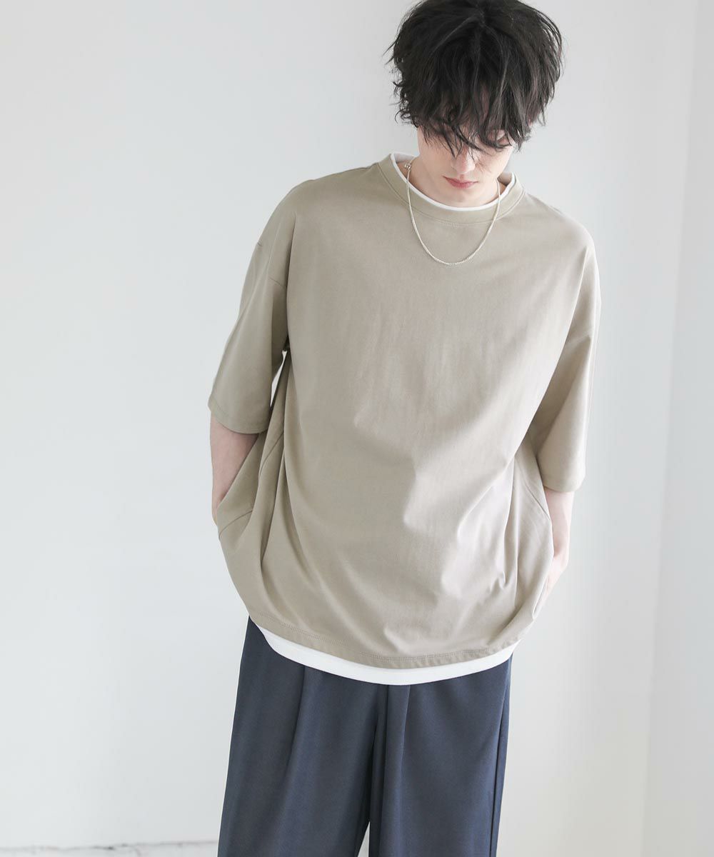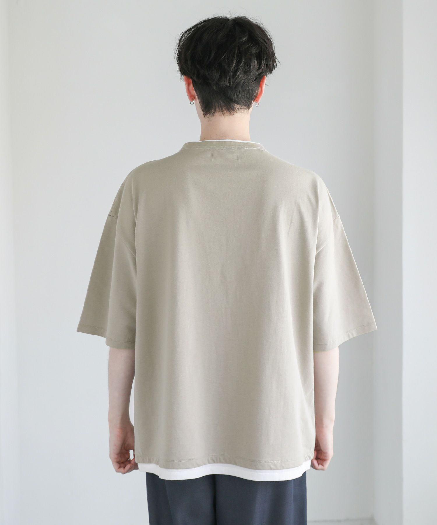 程よいゆとりをもたせたリラックスシルエットの半袖Tシャツ。襟、裾の2か所からインナーがチラッと見えているようなフェイクレイヤード仕様になっており、シンプルながら存在感のある1枚です。