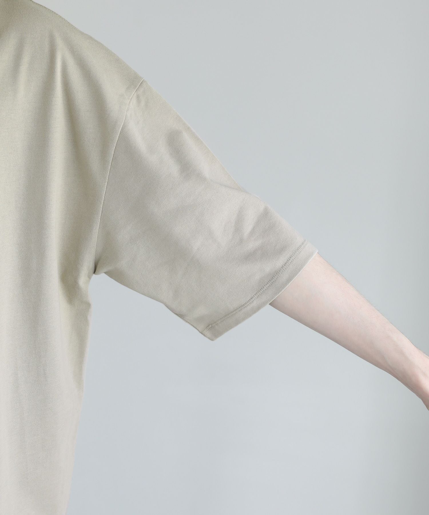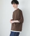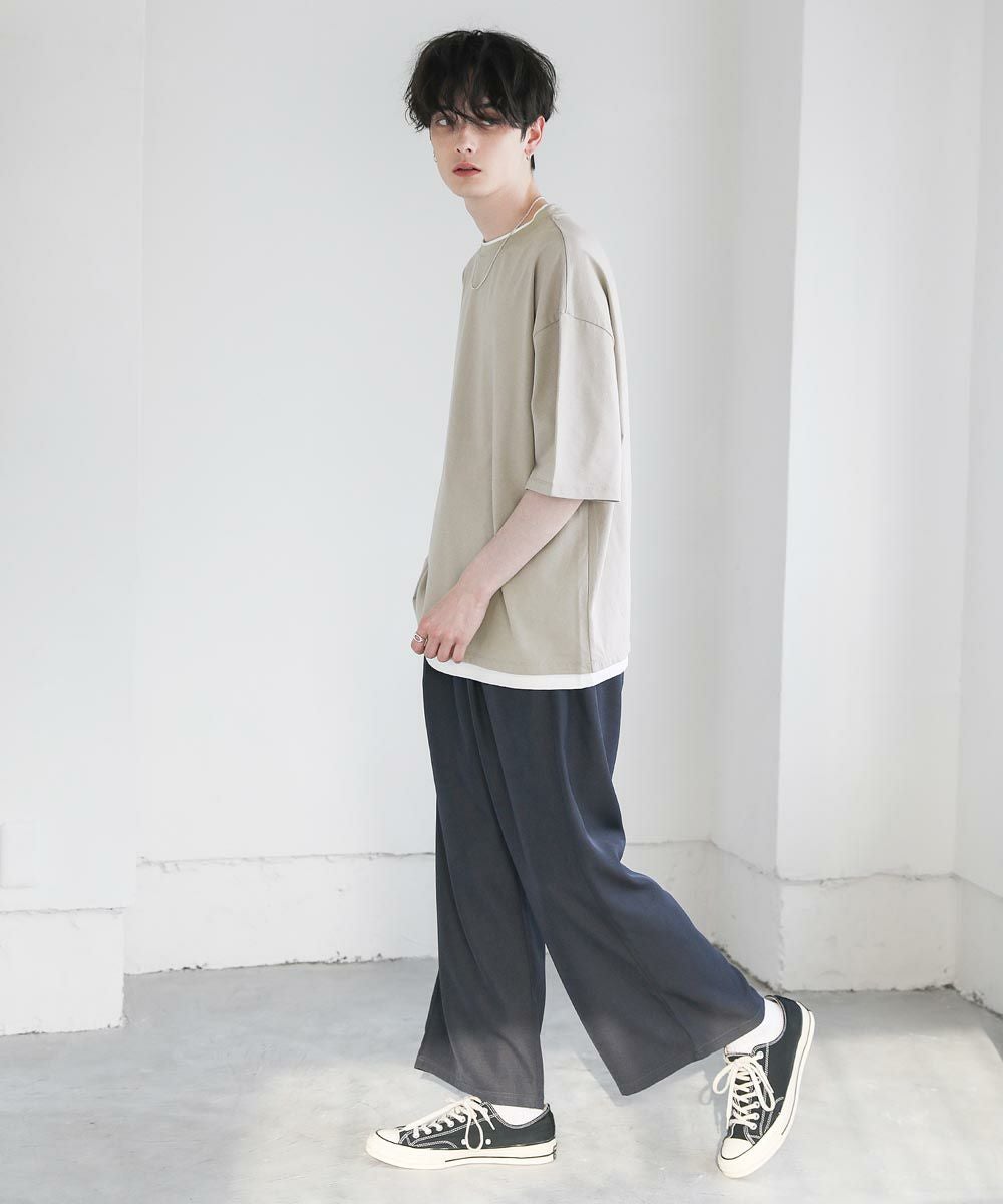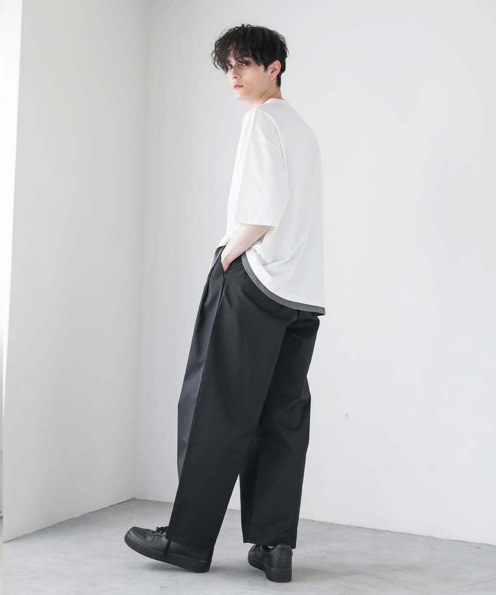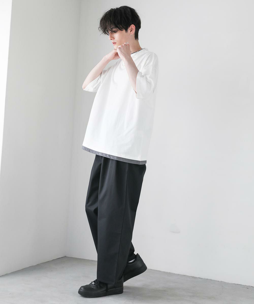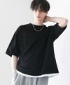 程よいゆとりをもたせたリラックスシルエットの半袖Tシャツ。襟、裾の2か所からインナーがチラッと見えているようなフェイクレイヤード仕様になっており、シンプルながら存在感のある1枚です。