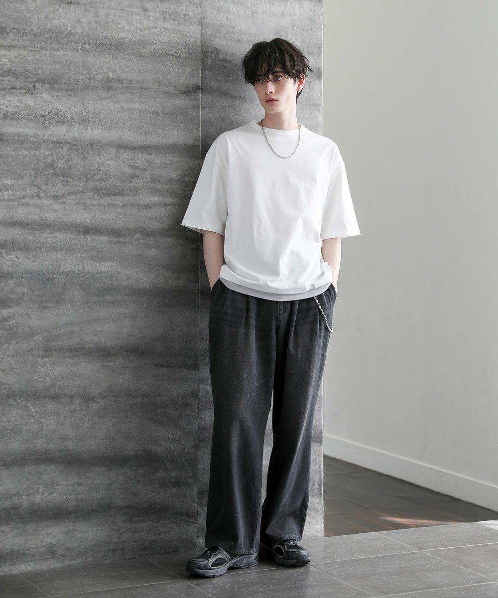 単色のシンプルなデザインなので、スラックスやデニム、ワイドパンツなど合わせるアイテムを選ばず着回すことができます。フェイクレイヤード仕様なので、1枚でバランスの取れたレイヤードコーデをお楽しみいただけます。