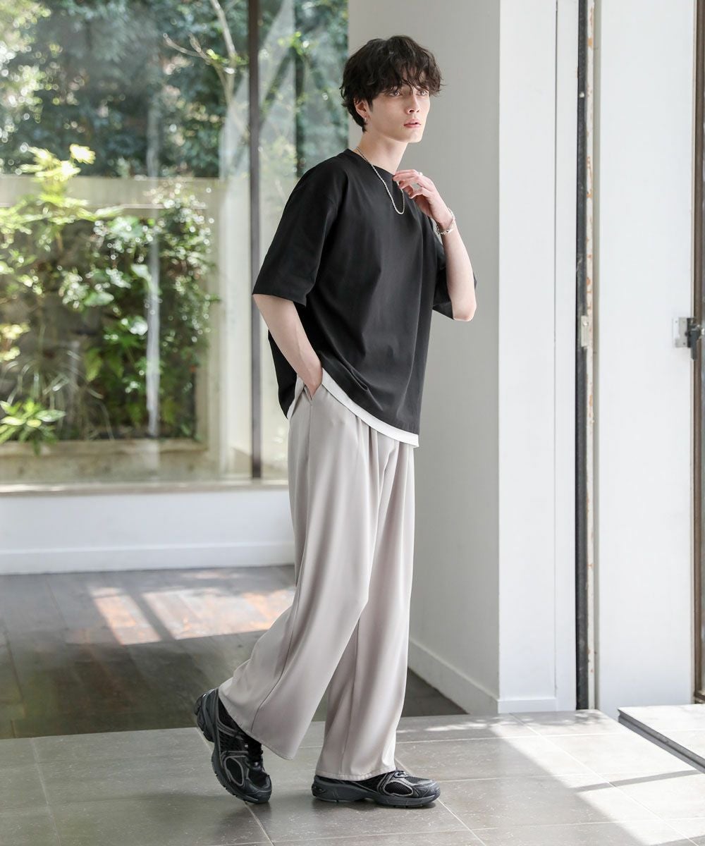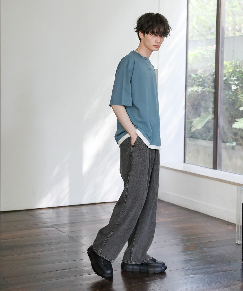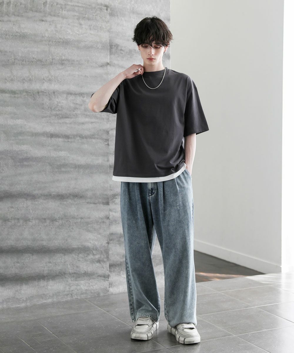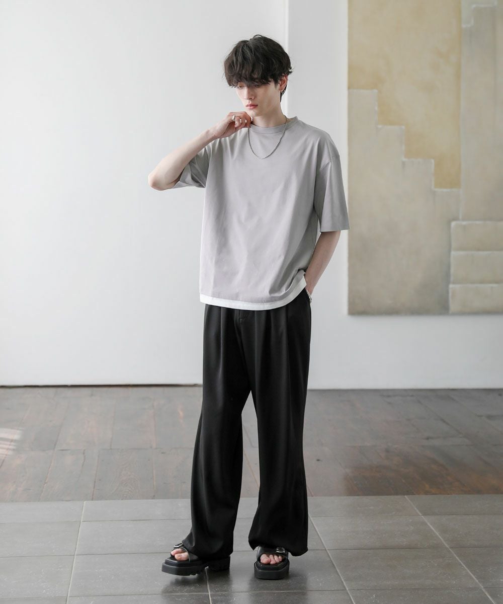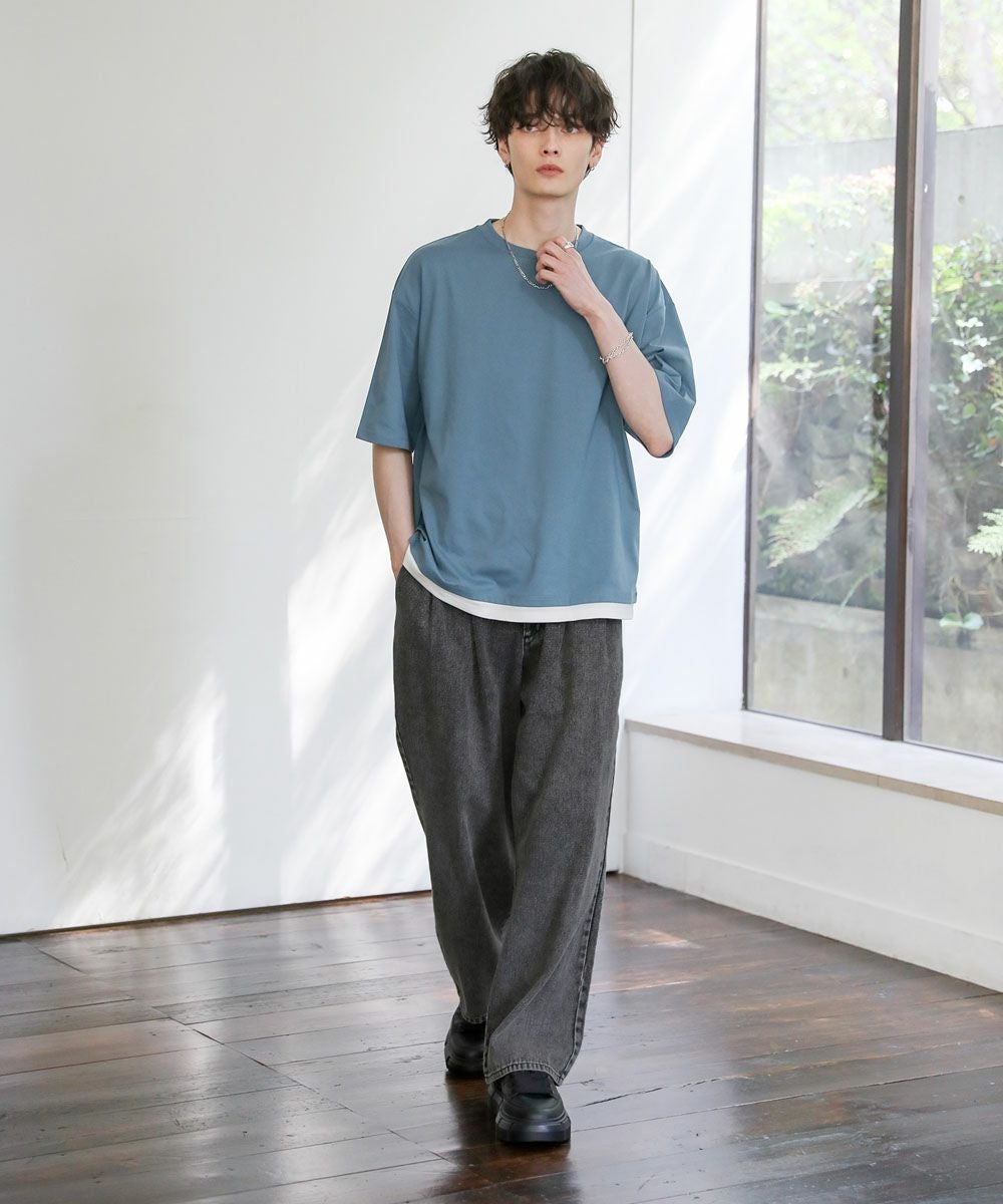 裾からインナーがチラッと見えているようなフェイクレイヤード仕様になっており、1枚でレイヤードスタイルが完成するアイテム。