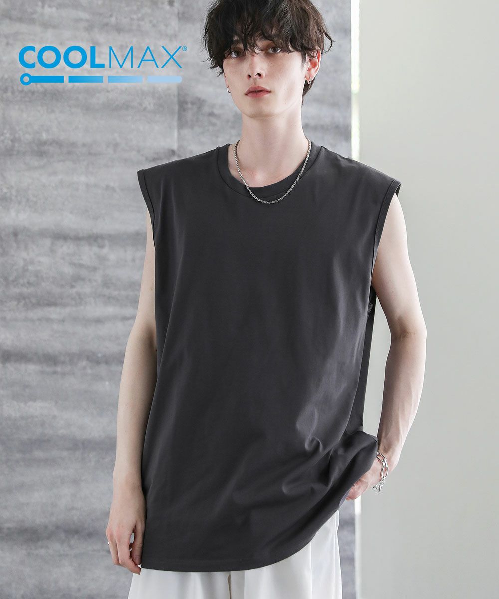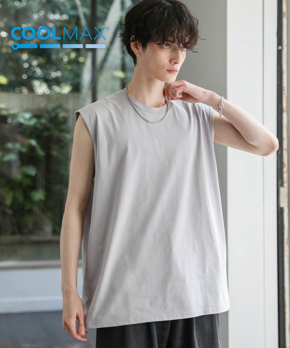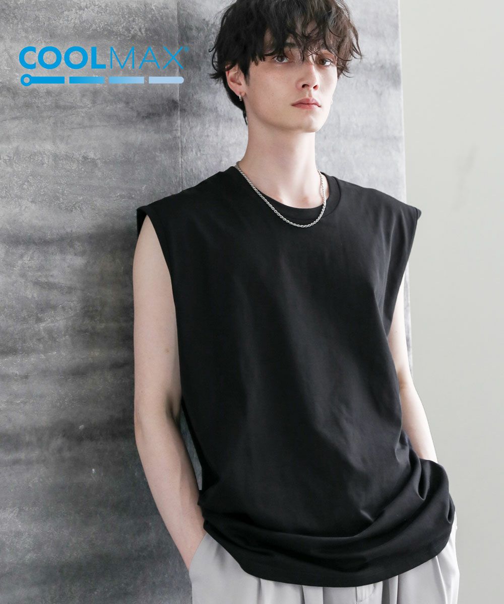 ドライな着心地を保つ機能素材、COOLMAX(R)(クールマックス)を使用したノースリーブカットソー。COOLMAXとは、優れた吸水速乾性を持つ夏の定番素材。