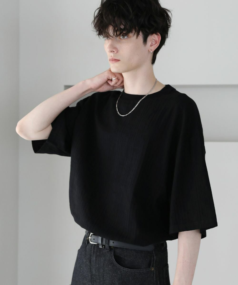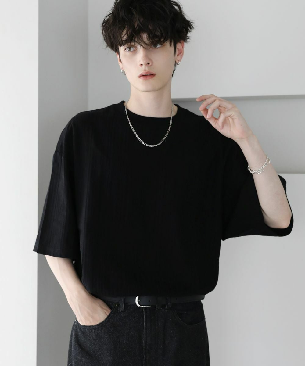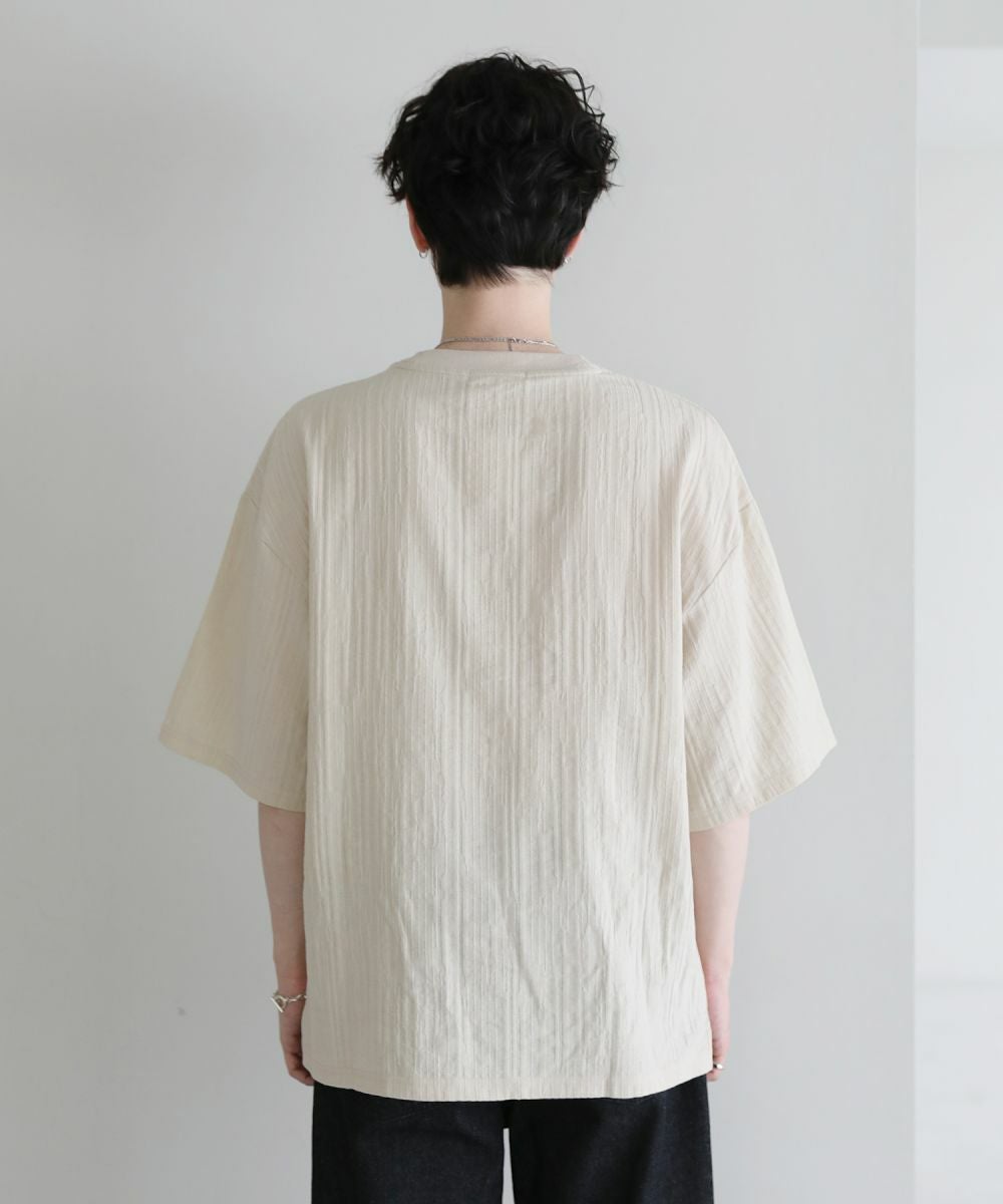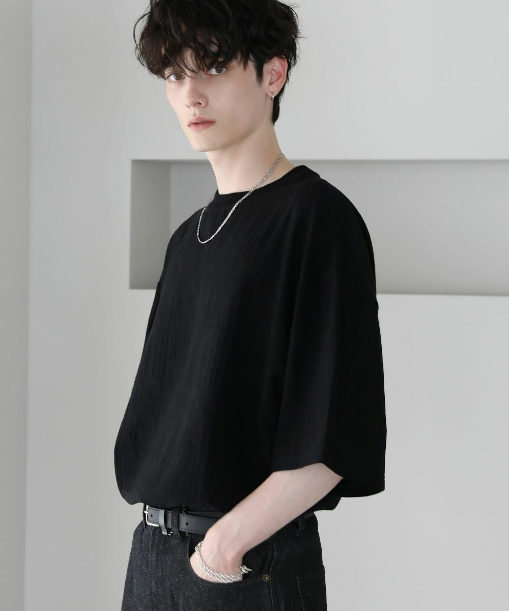 表情豊かなジャガード編みで仕立てた5分袖Tシャツ。立体感のある編み地が、シンプルなスタイルをお洒落に見せてくれます。ゆったりとしたシルエットに肘までかかる5分袖、サイドスリットの抜け感がリラックスした夏のスタイルを演出。定番のブラック、柔らかな色合いのキナリの着回しに欠かせない2色展開。1枚で着映えるおすすめのアイテムです。