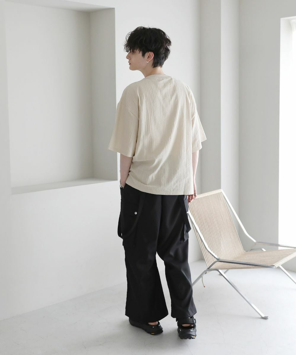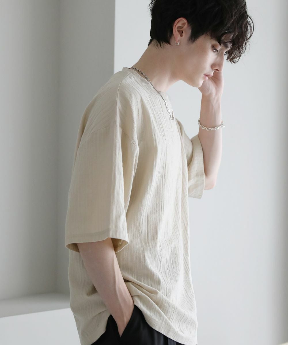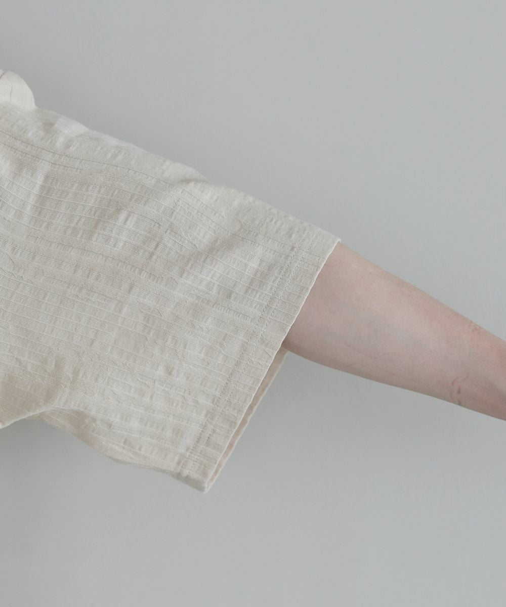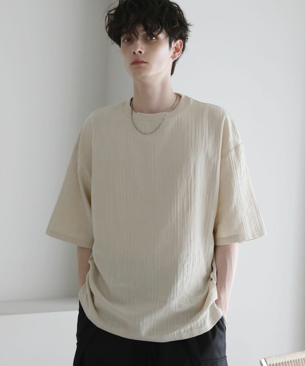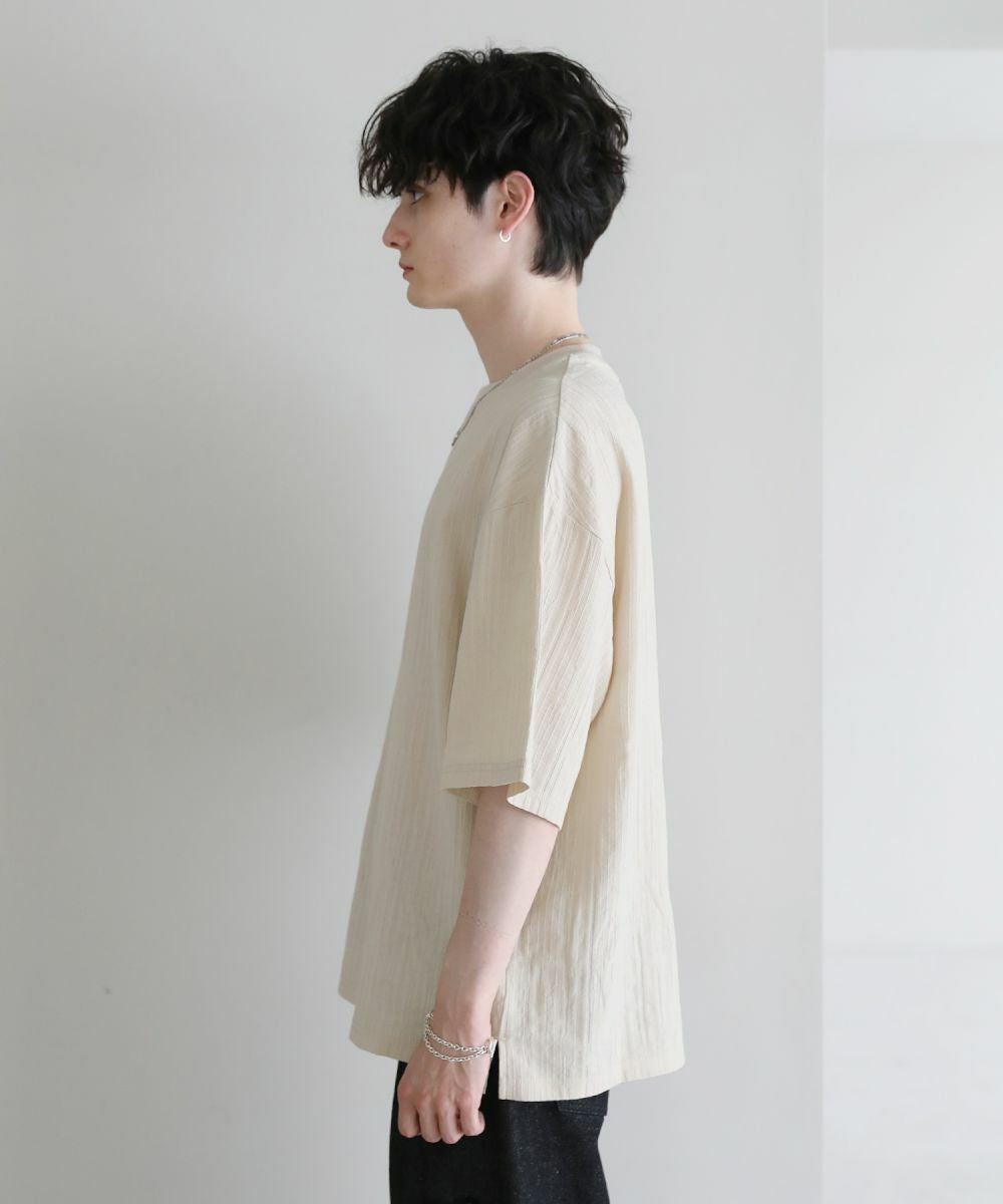 表情豊かなジャガード編みで仕立てた5分袖Tシャツ。立体感のある編み地が、シンプルなスタイルをお洒落に見せてくれます。ゆったりとしたシルエットに肘までかかる5分袖、サイドスリットの抜け感がリラックスした夏のスタイルを演出。定番のブラック、柔らかな色合いのキナリの着回しに欠かせない2色展開。1枚で着映えるおすすめのアイテムです。