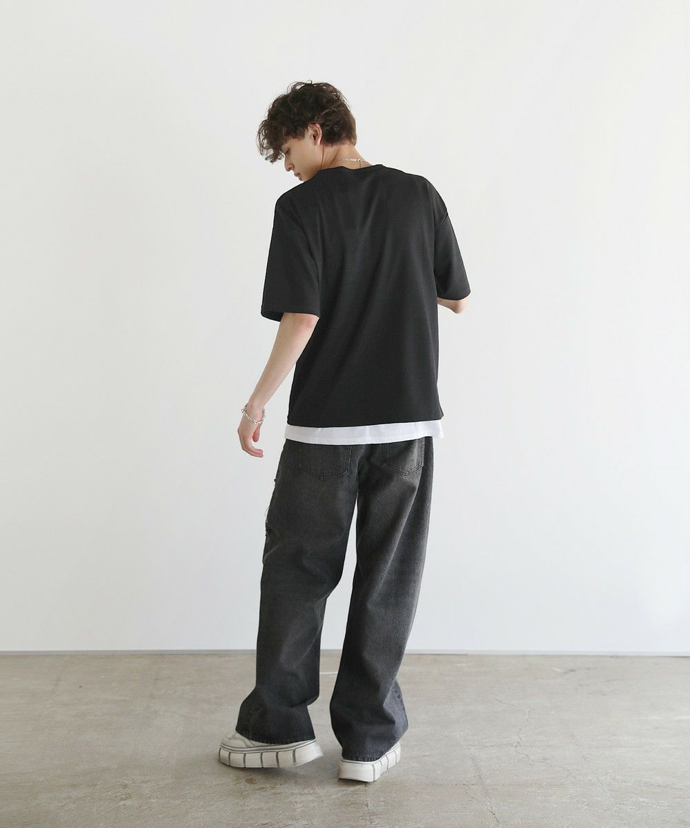 無地ベースでありながら表面感のあるTシャツなので、一枚で着てもサマになります。シンプルなクルーネックデザインなのでどんなボトムスとも合わせやすい一着です。
