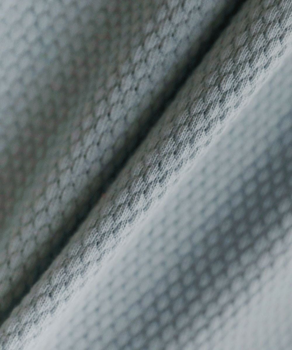 本体部分には、パイナップルのような形をしたポコポコと表情のあるニット生地を使用しました。生地の凹凸が肌への接触面積を押さえ、汗ばむ時期でもべたつかずに着用いただけます。肌馴染みの良い綿とサラッとしたポリエステルを混紡したポリコットン素材を使用しているので、柔らかくもサラッとした爽やかな肌触りです。