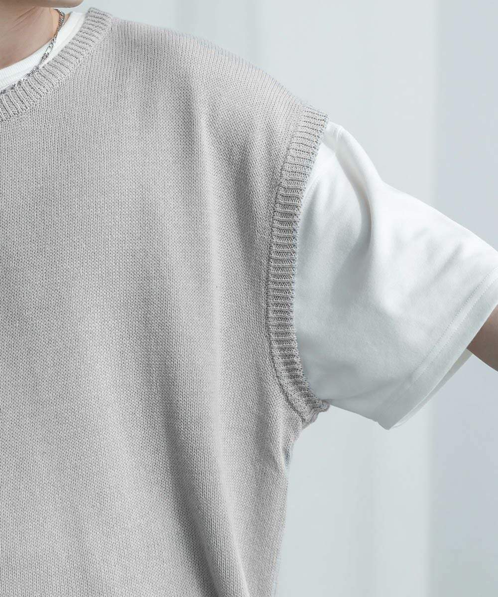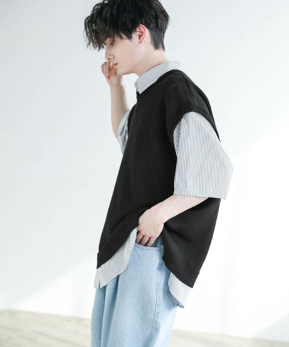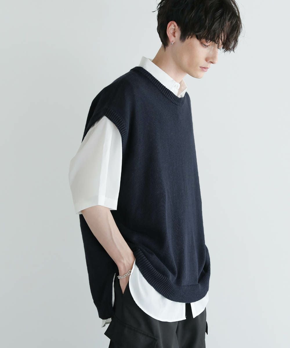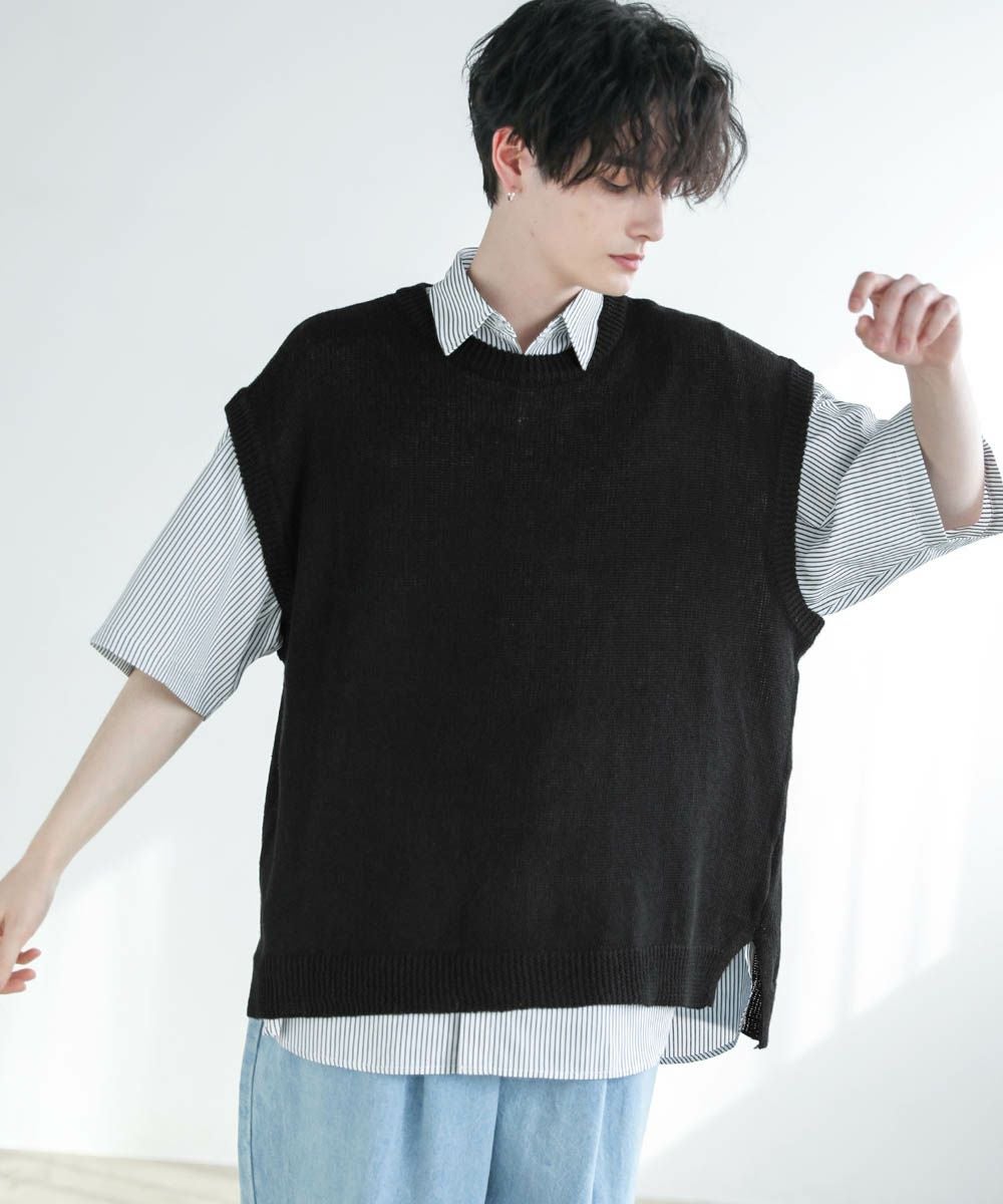清涼感のある綿麻素材を使用したサマーニットベスト。シンプルになりがちな春夏の着こなしに変化をつけられるアイテムです。