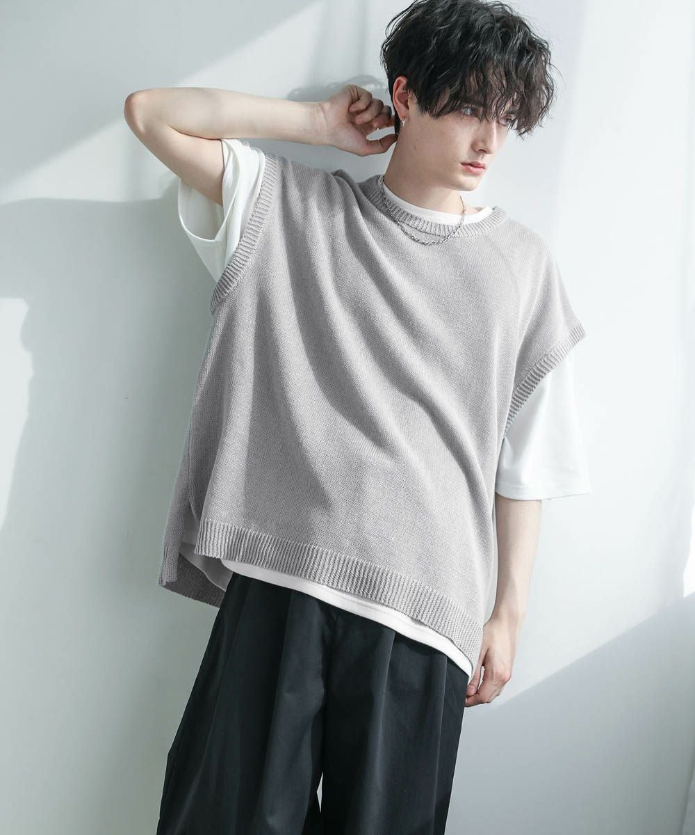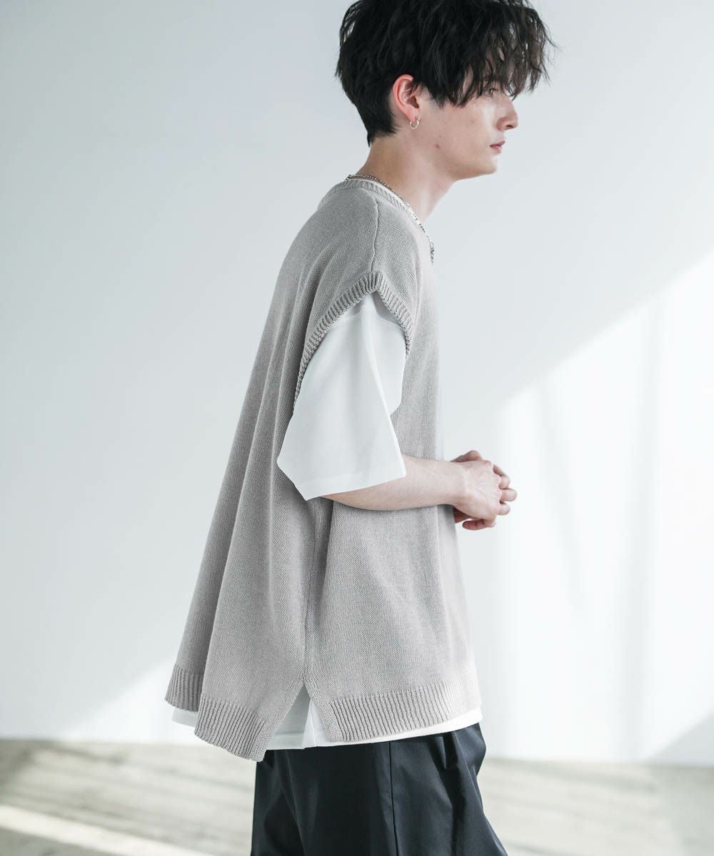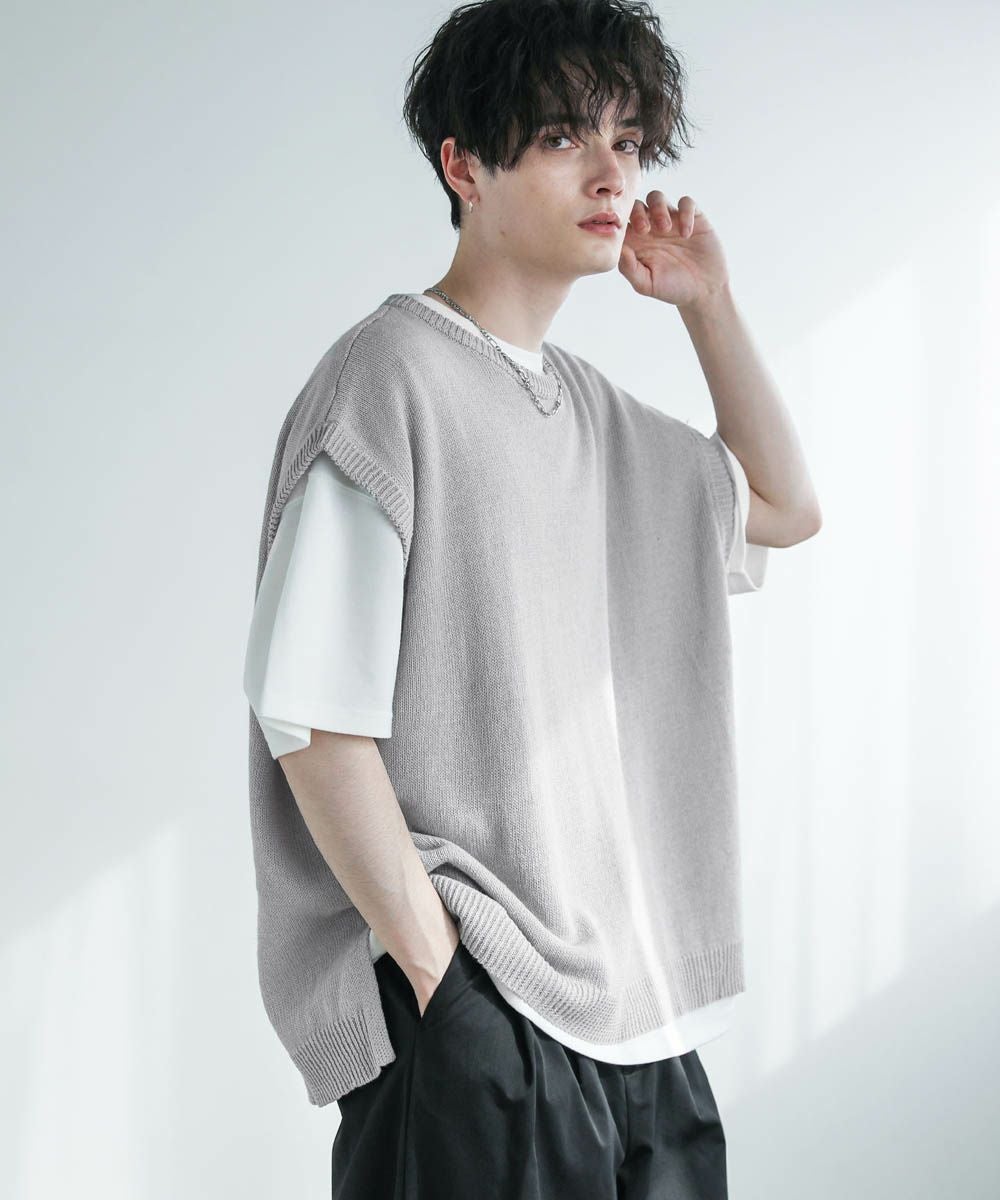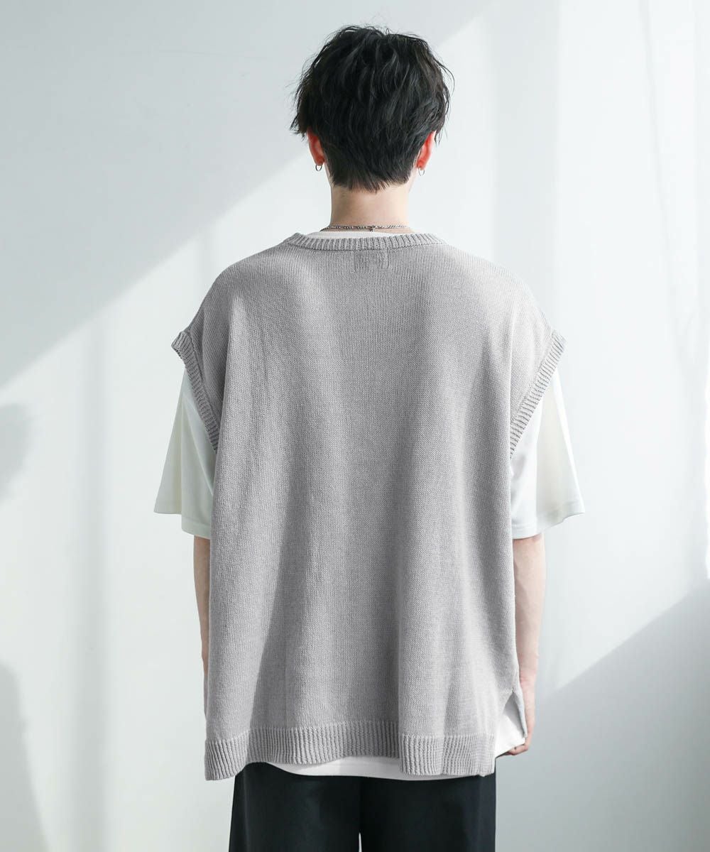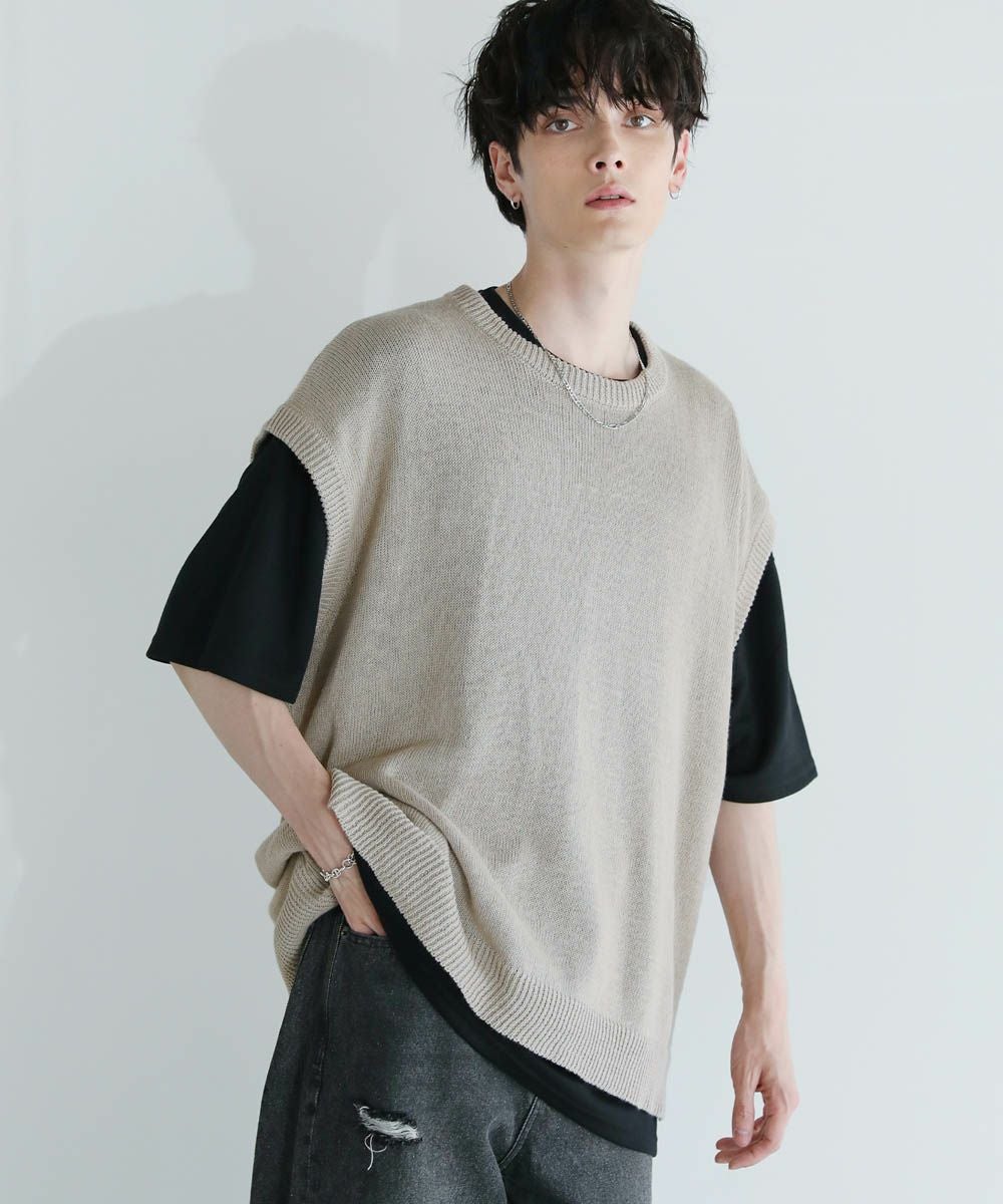 ゆったりとしたシルエットと浅めに入ったサイドスリットが抜け感をプラス。腕ぐりにゆとりを持たせているので、ビッグTやルーズシャツなど大きめのインナーともレイヤードがキレイに決まります。サラッとした肌触り&通気性に優れた薄手の綿麻ニット素材は暑い季節も快適に着用できます。季節感のあるリラックスした雰囲気&着こなしの幅を広げてくれるおすすめの1枚です。