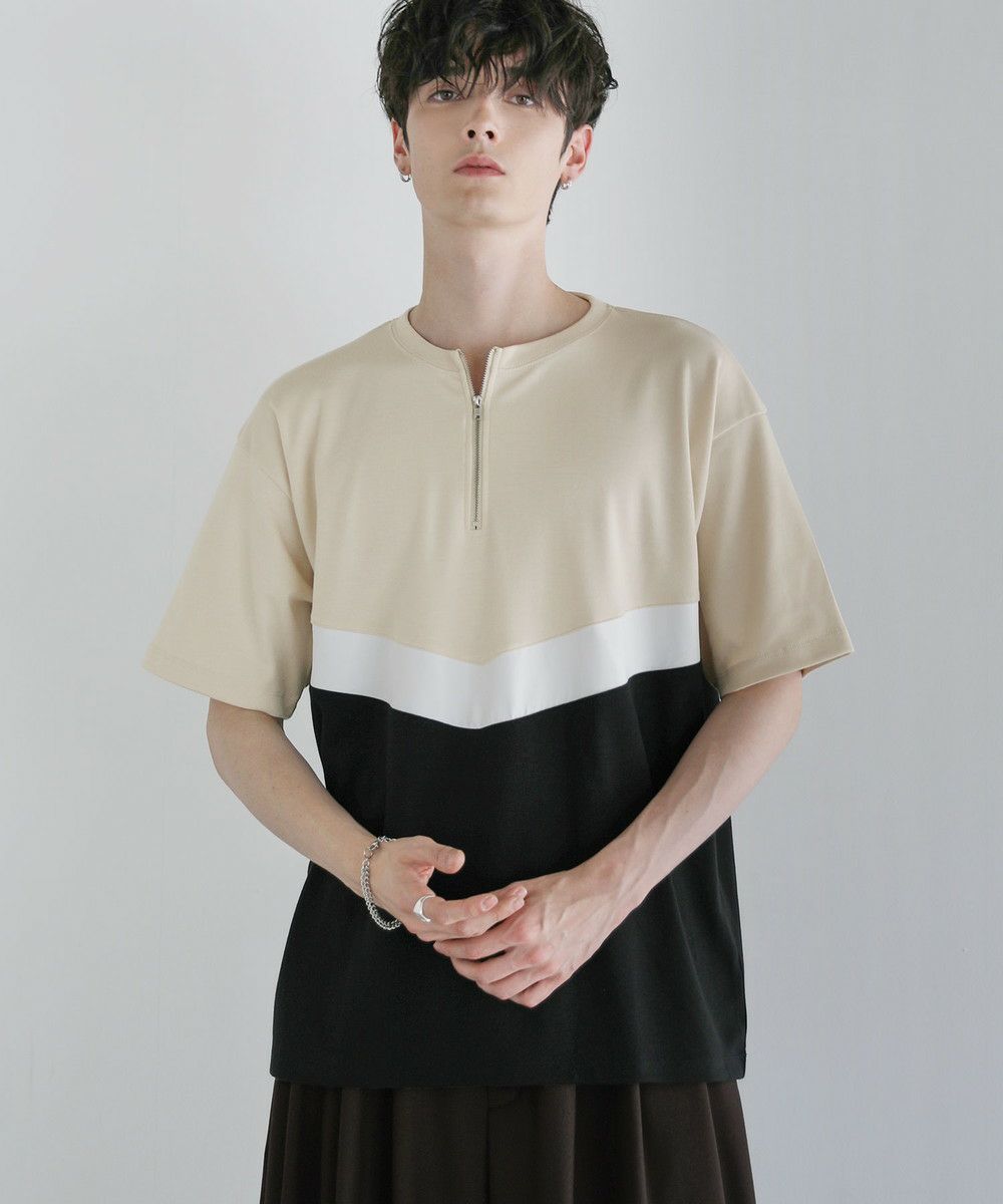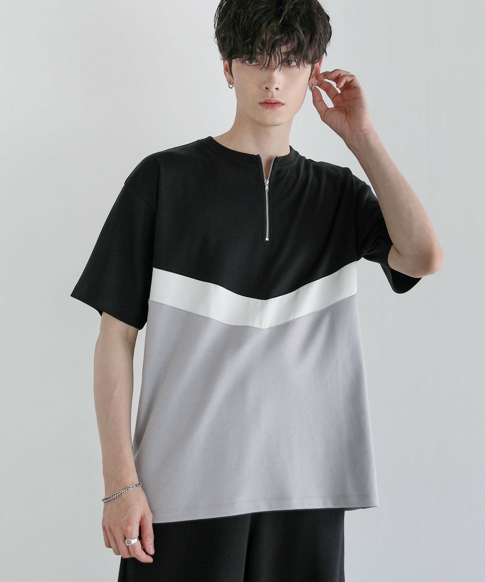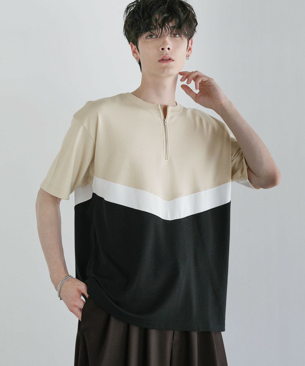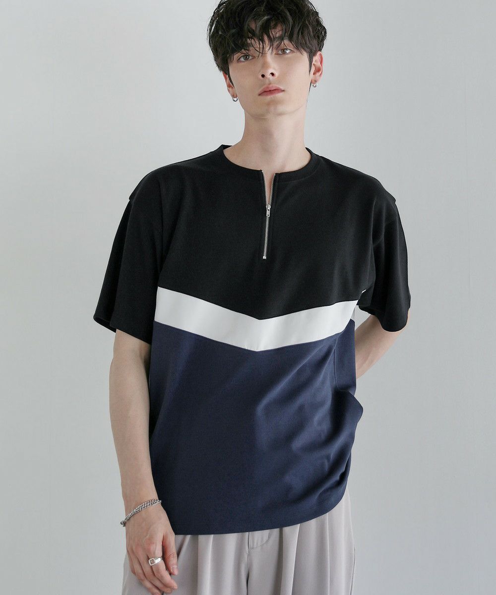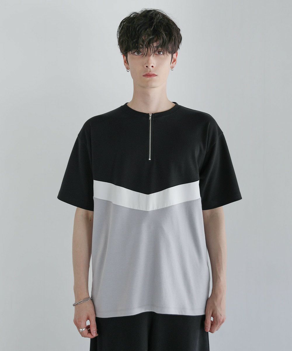 異素材のV字デザインで上下を貼り合わせたハーフジップTシャツ。