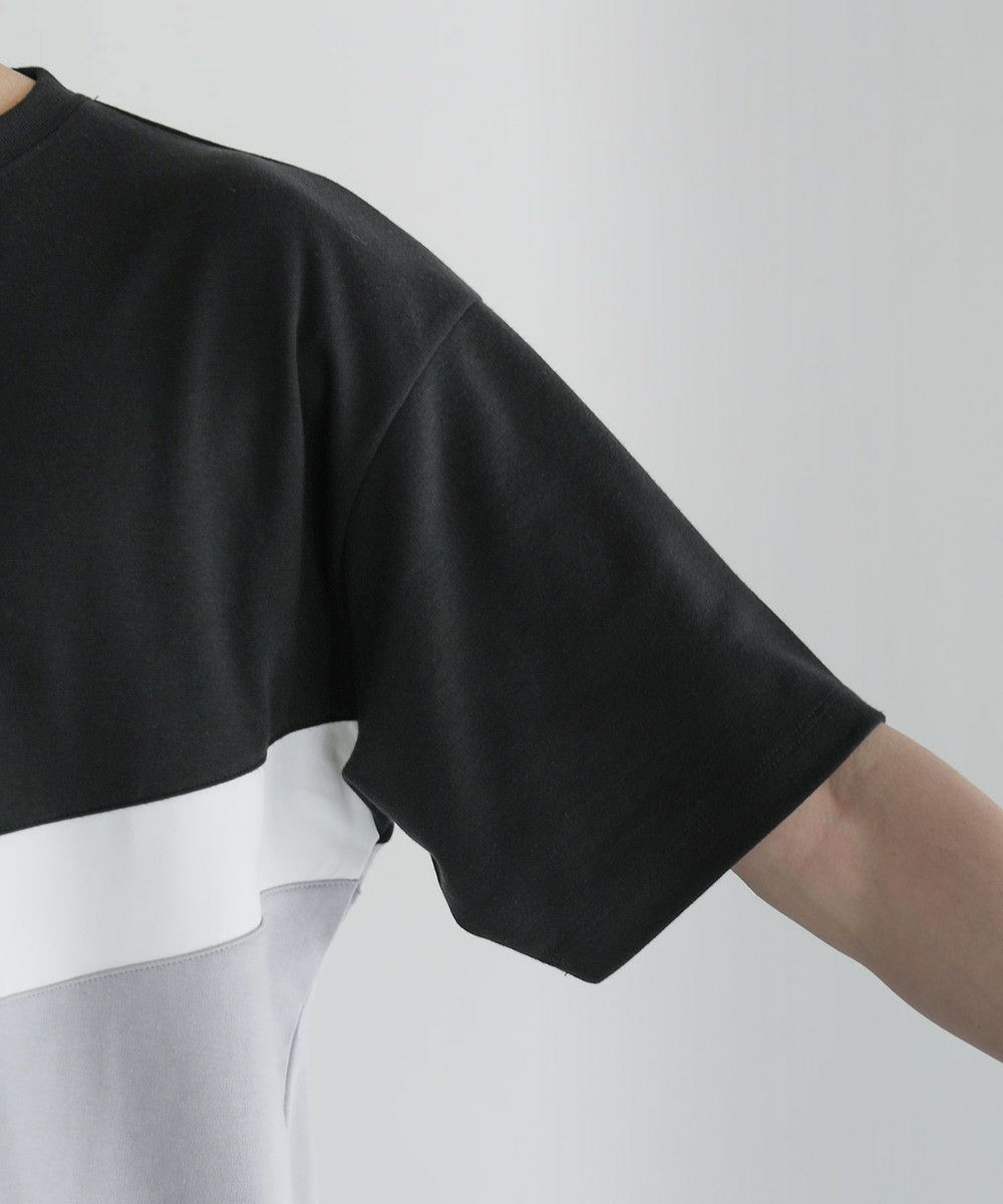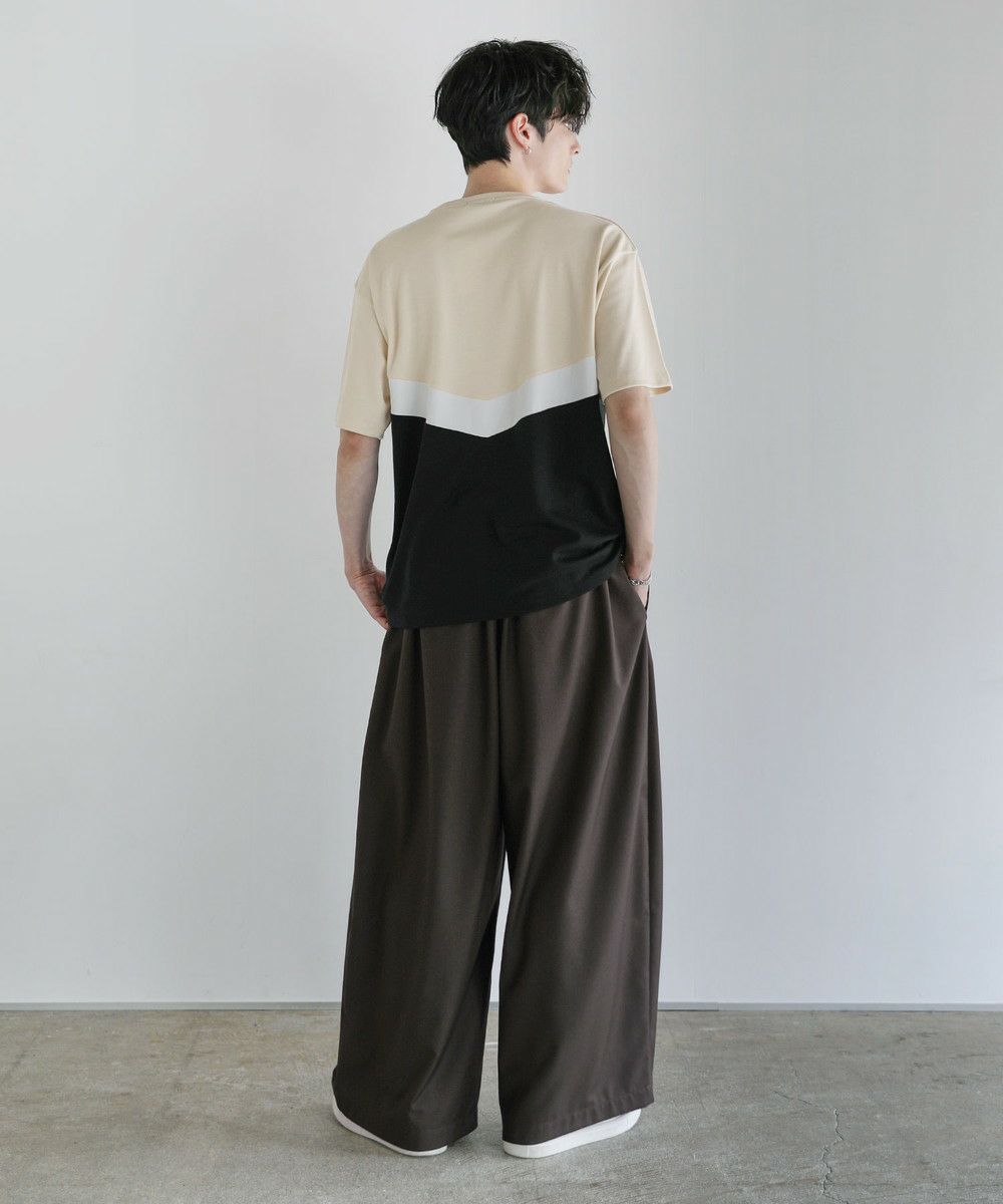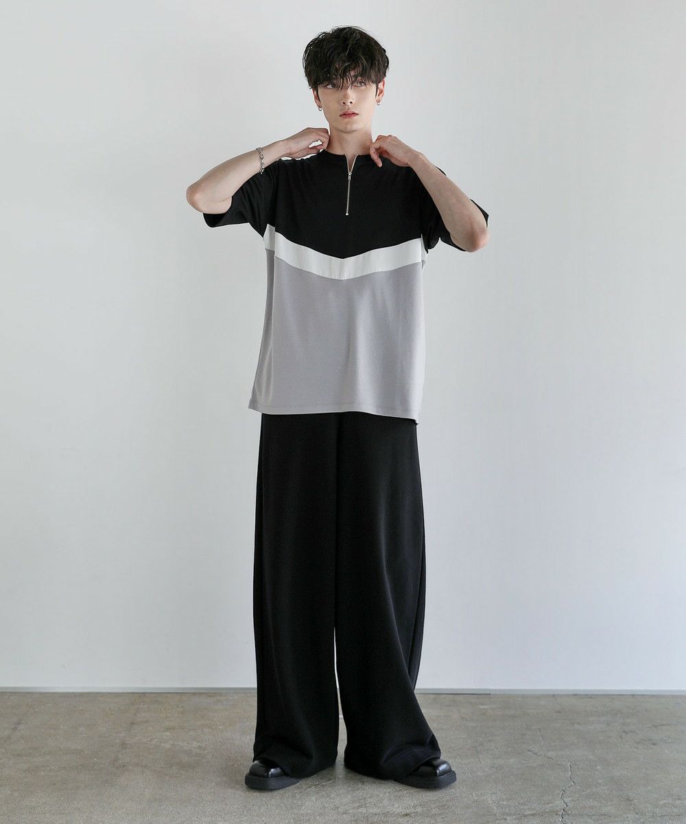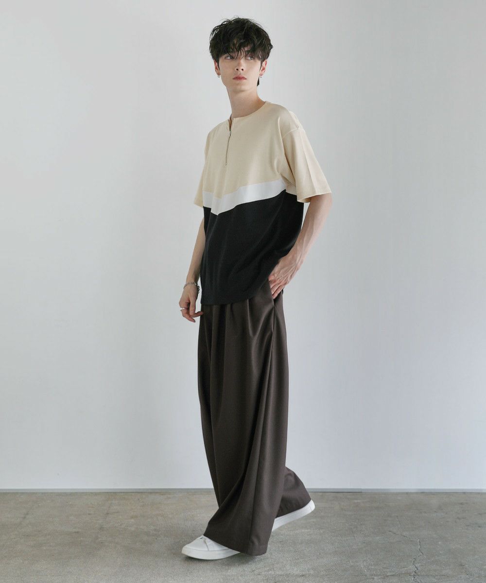 V字のホワイト部分にフェイクスウェード生地を使い、お洒落な切り替えデザインのTシャツに仕上げました。首元はベーシックなクルーネックタイプにハーフジップを施すことで着こなしの幅を広げてくれます。ゆとりのある身幅とドロップショルダーがトレンドのオーバーサイズ感を演出。落ち着いた色合いのベージュ×ブラック、ブラック×アイスグレー、ブラック×ネイビーの3色展開です。