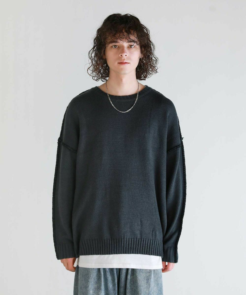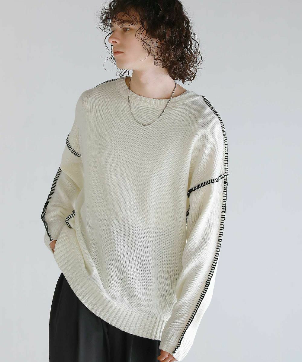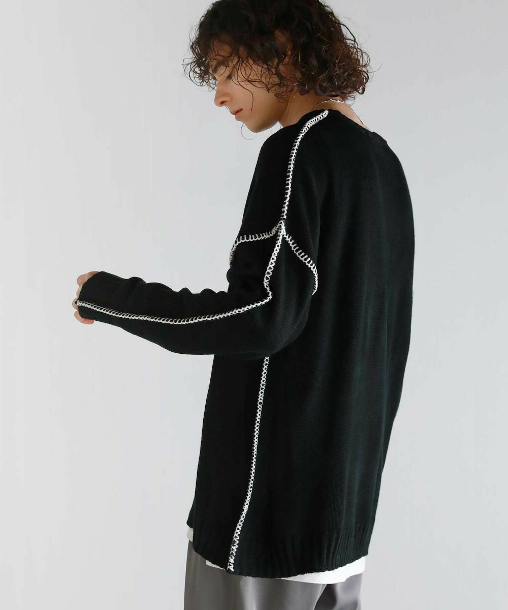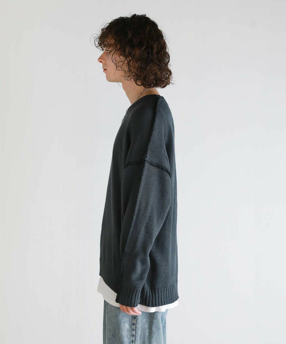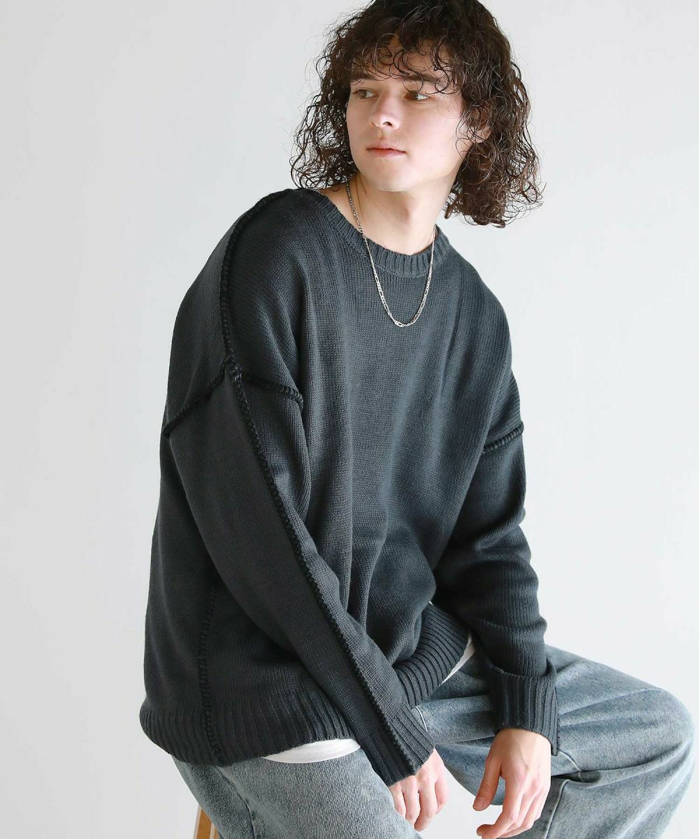 ビックシルエット配色ハンドステッチ長袖クルーネックニット