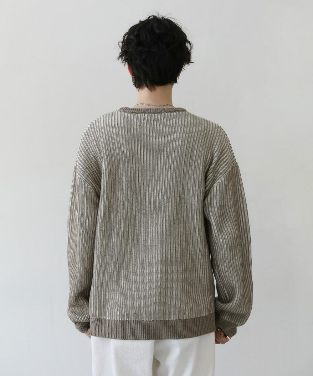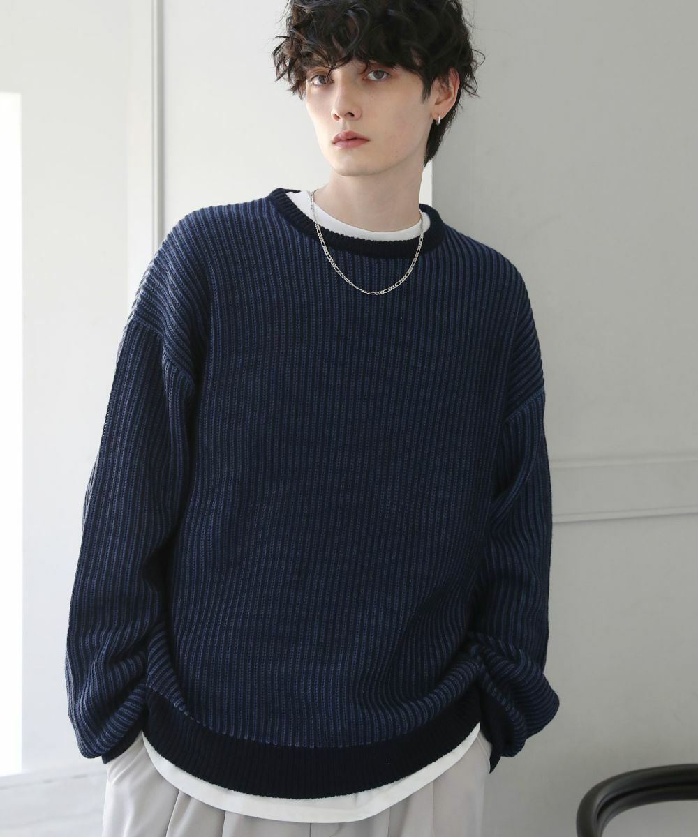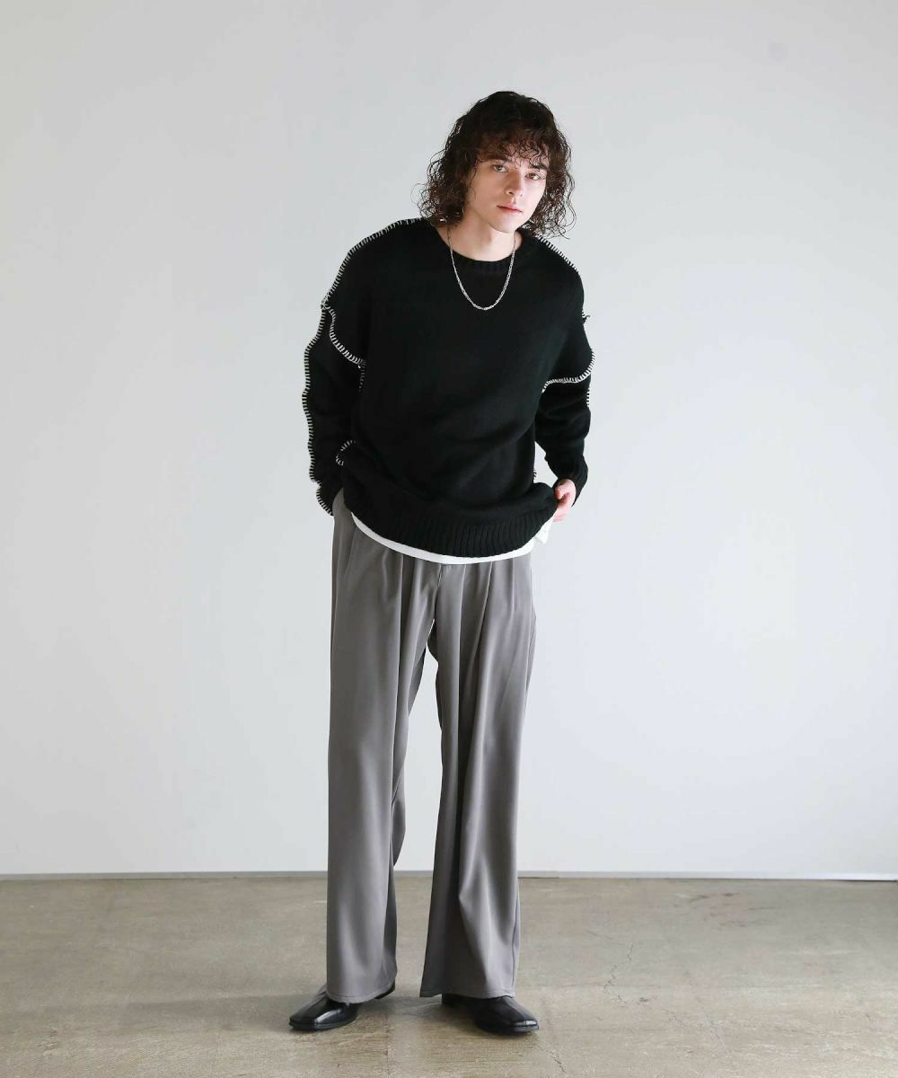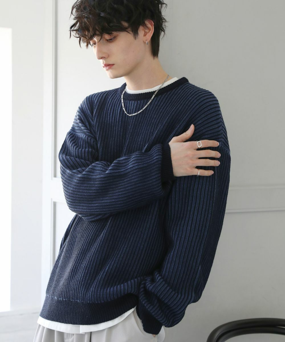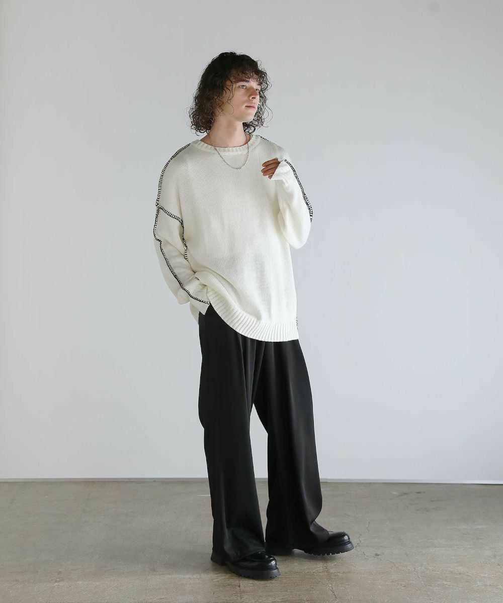 ビックシルエット配色ハンドステッチ長袖クルーネックニット
