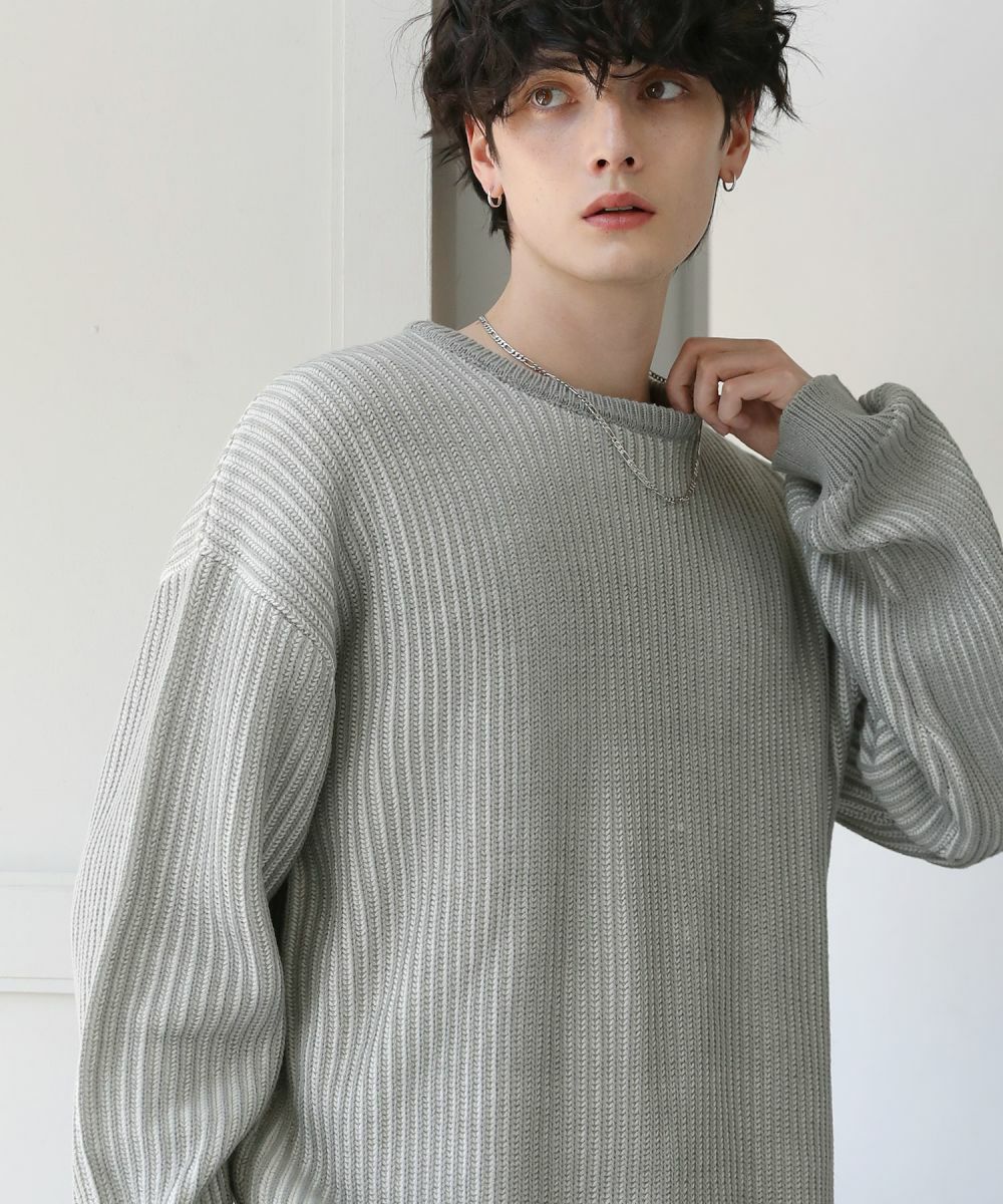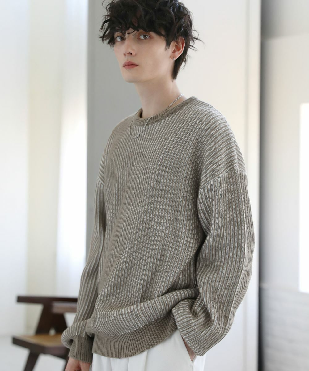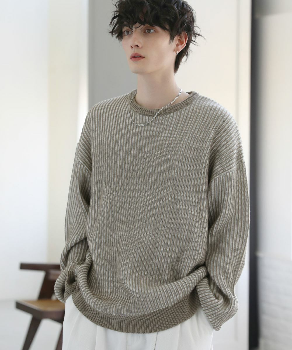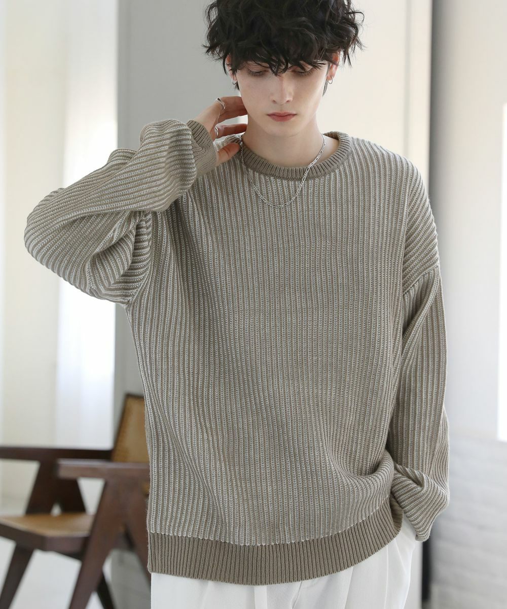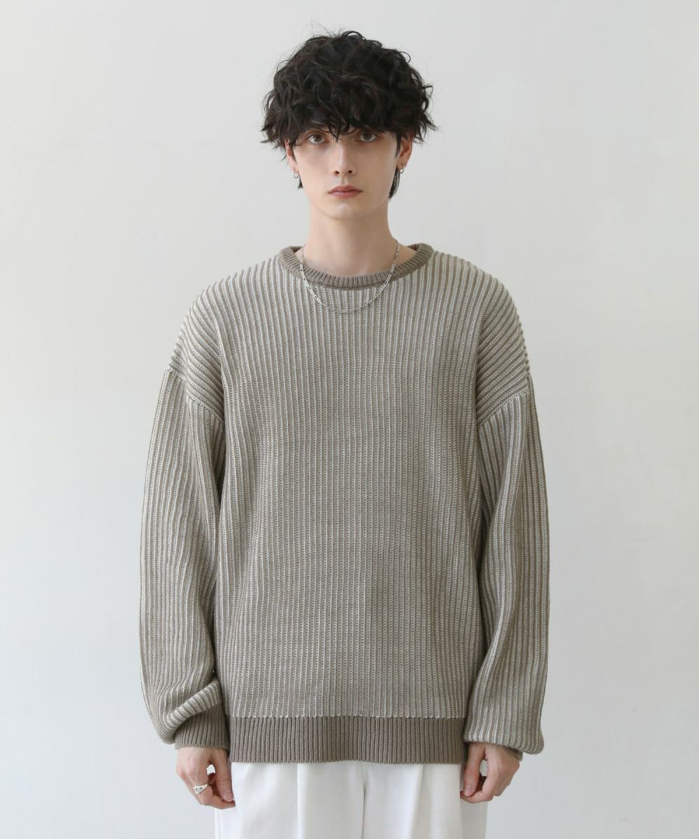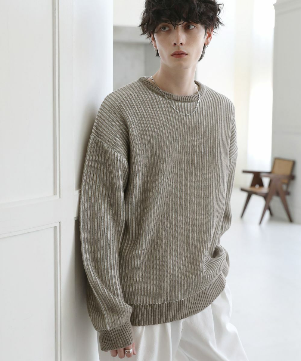 ビックシルエット配色ハンドステッチ長袖クルーネックニット
