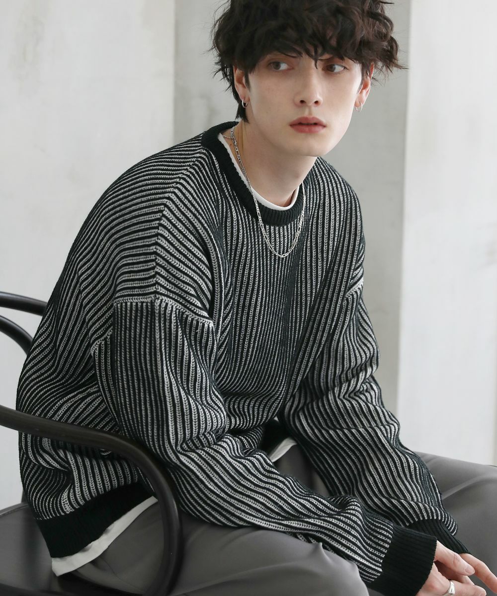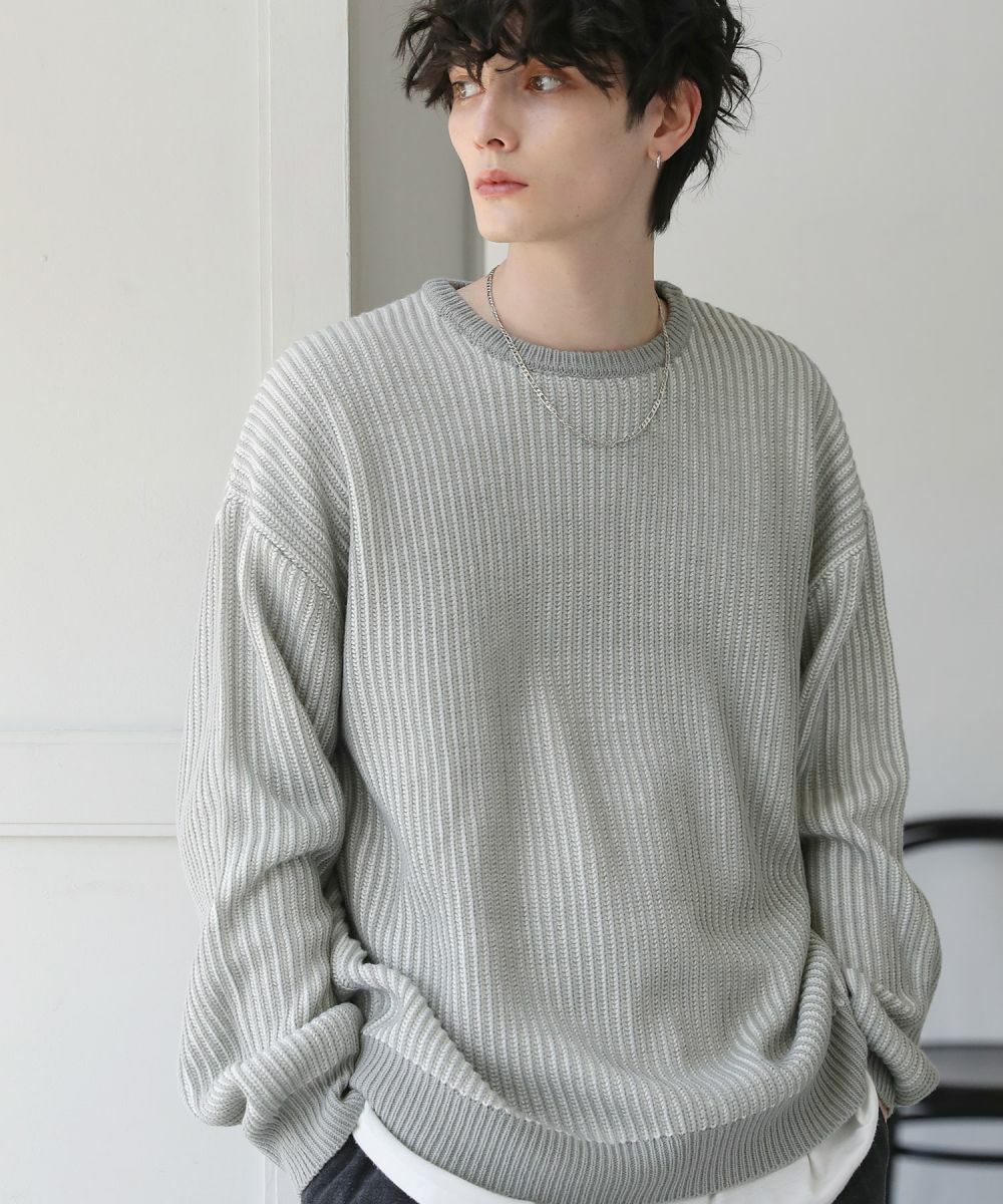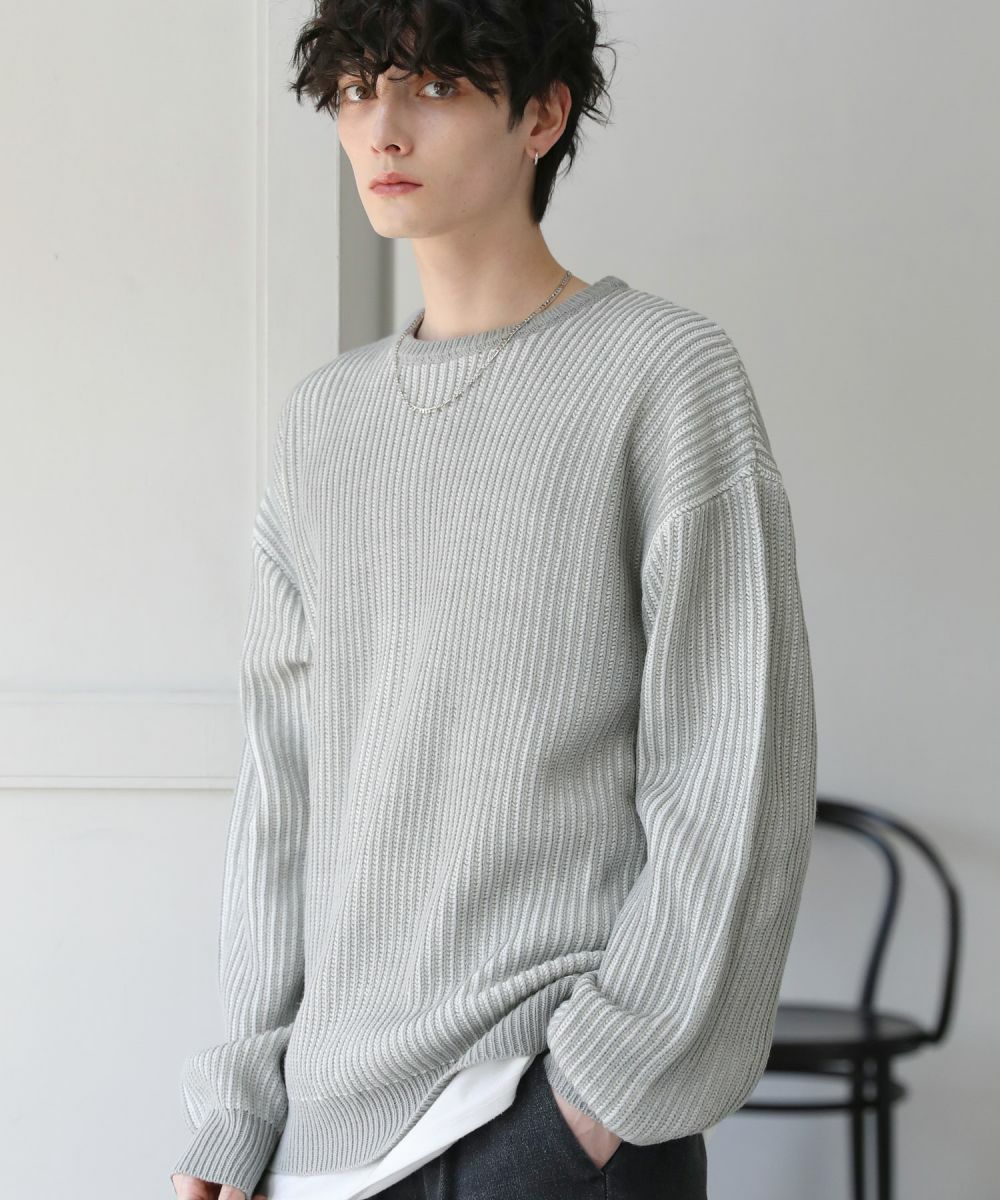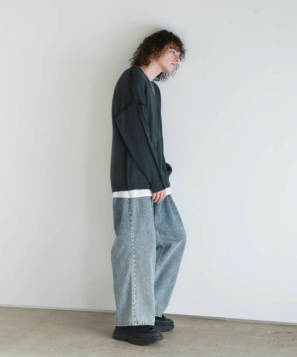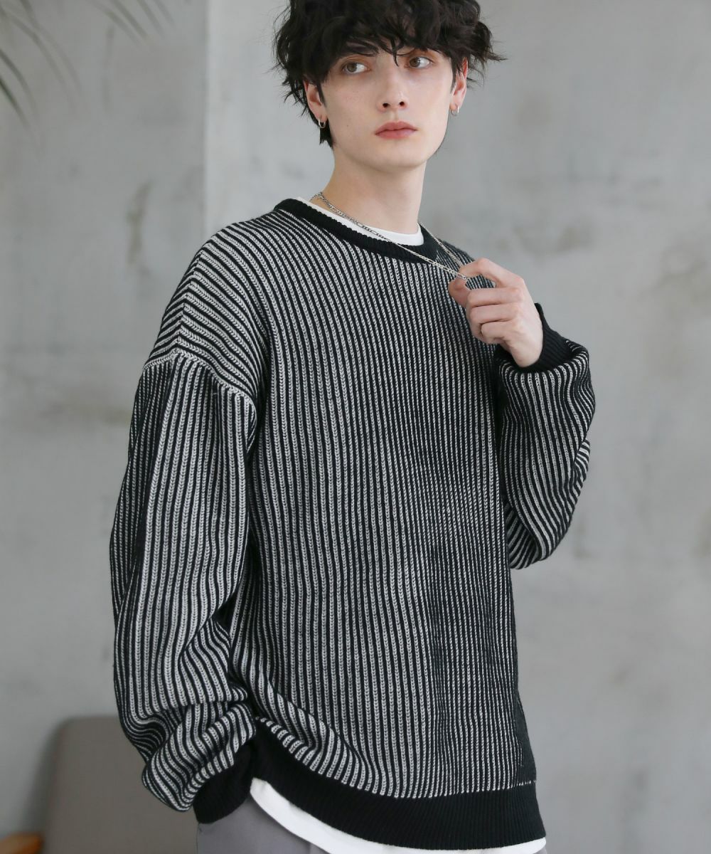 ビックシルエット配色ハンドステッチ長袖クルーネックニット