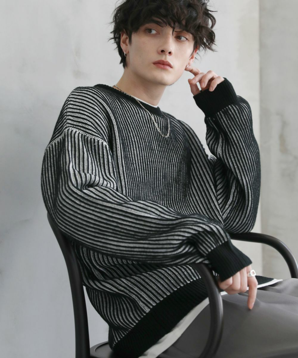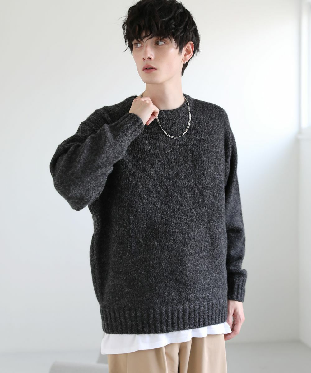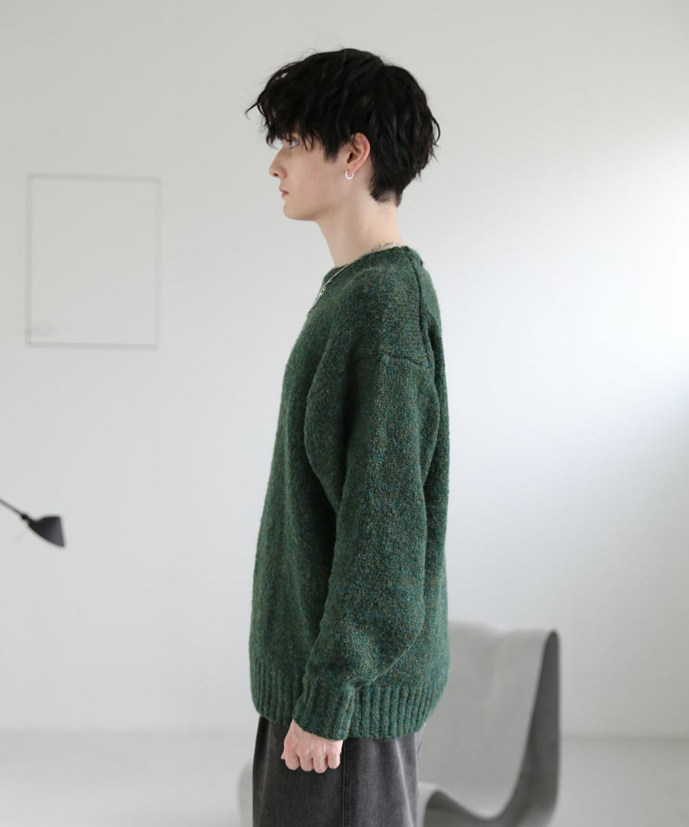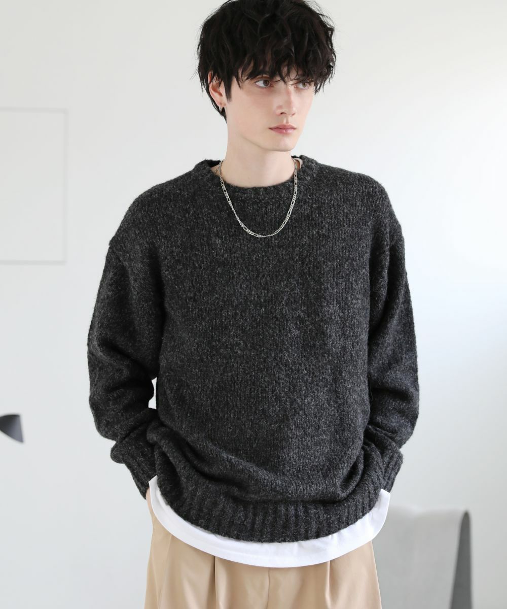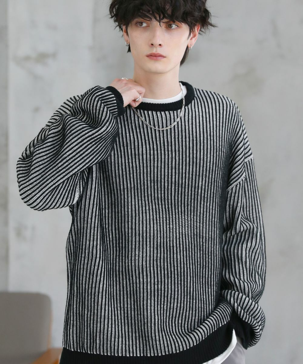 ビックシルエット配色ハンドステッチ長袖クルーネックニット