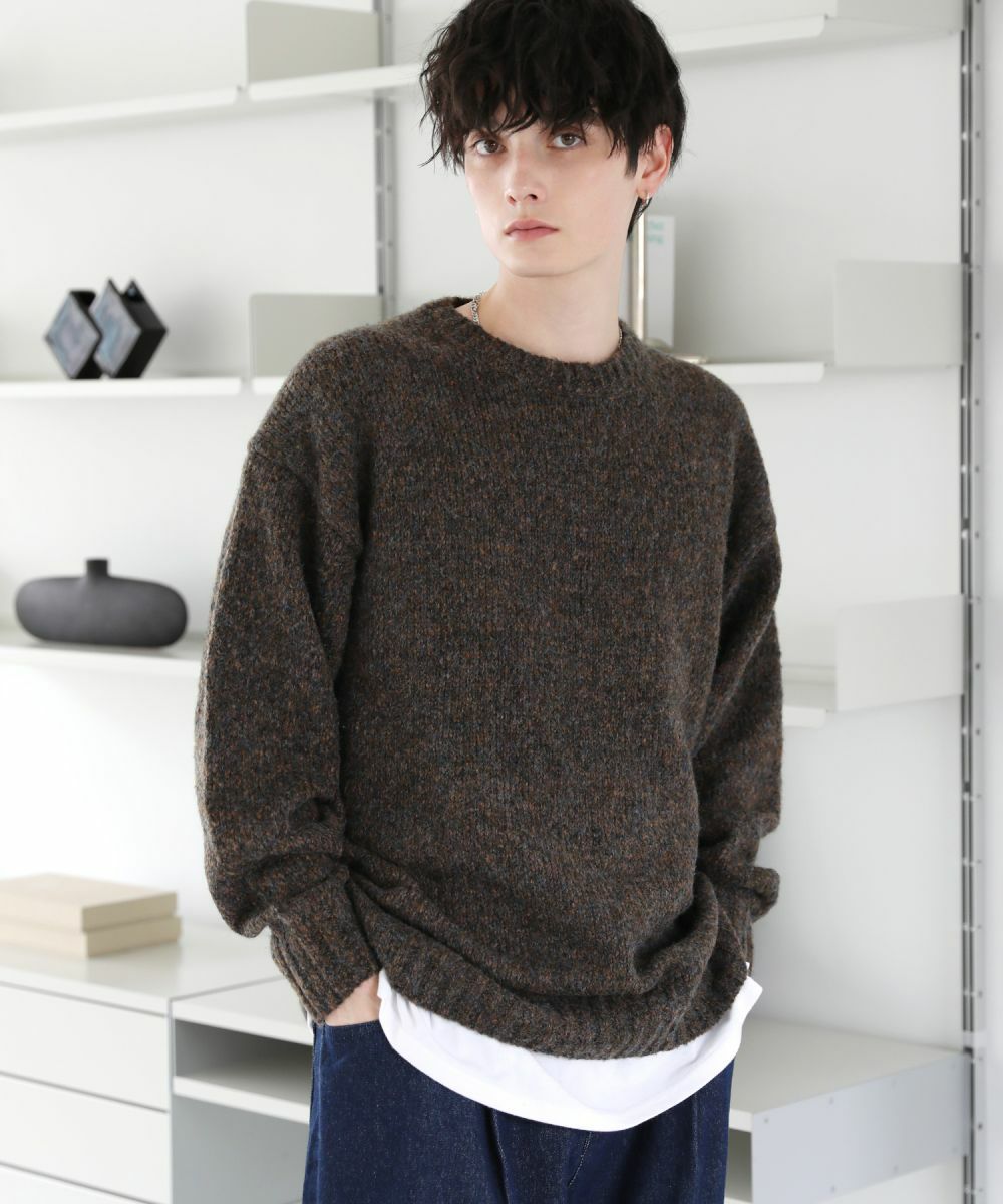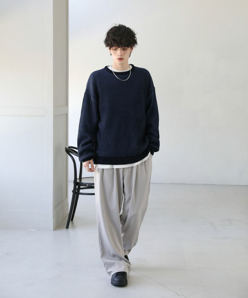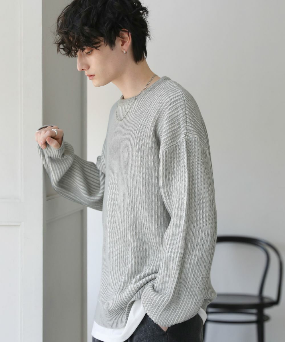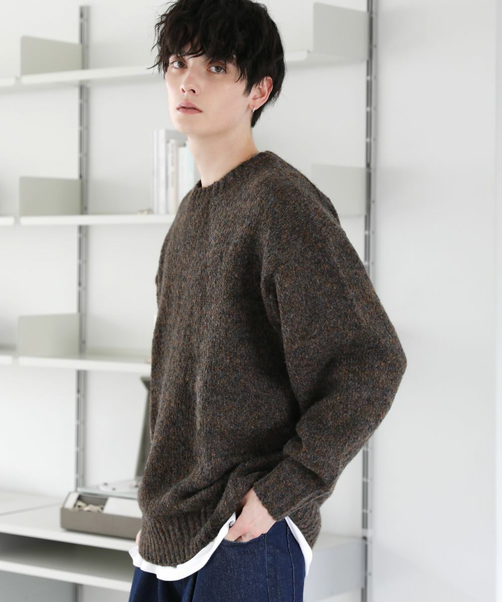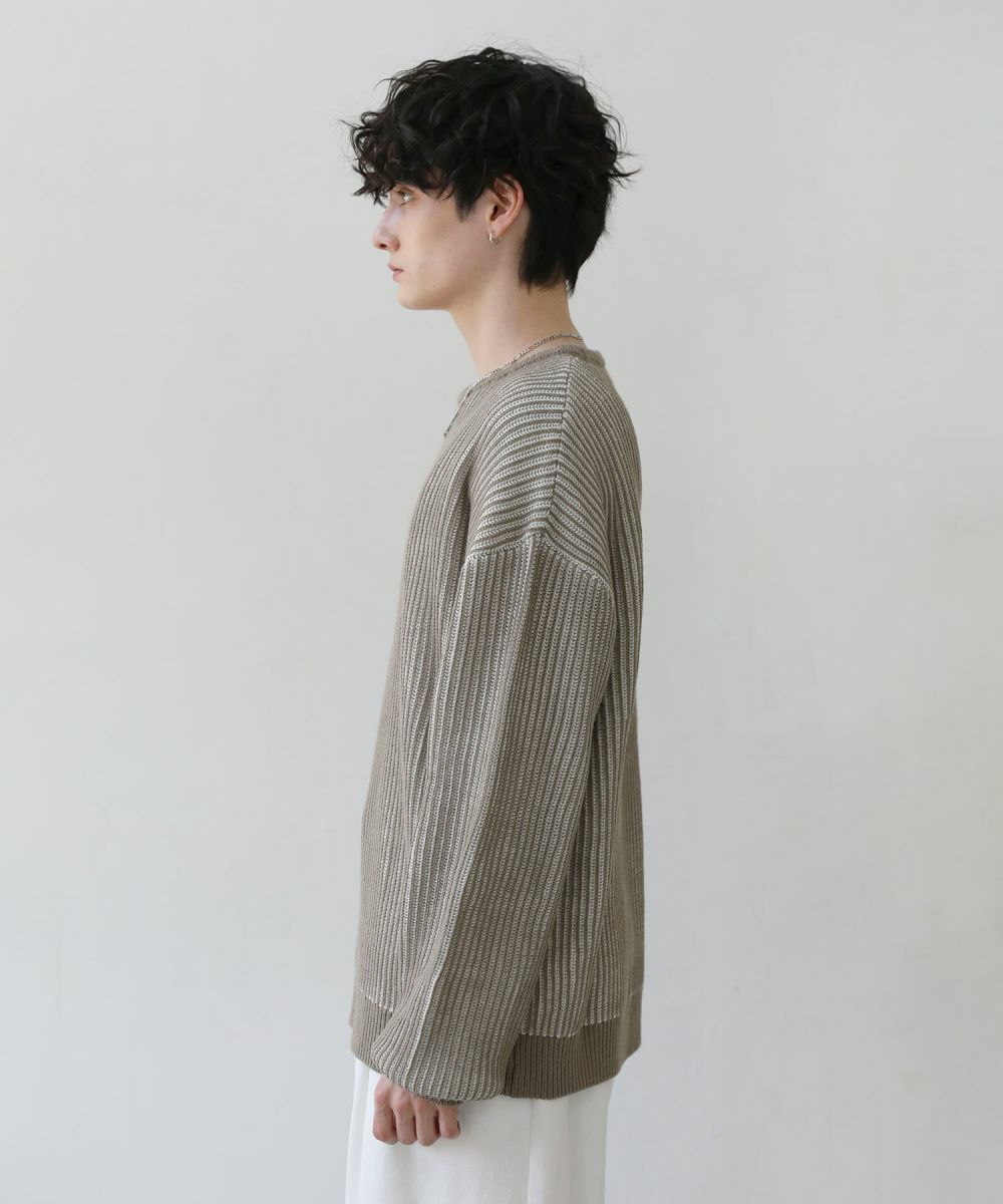 ビックシルエット配色ハンドステッチ長袖クルーネックニット