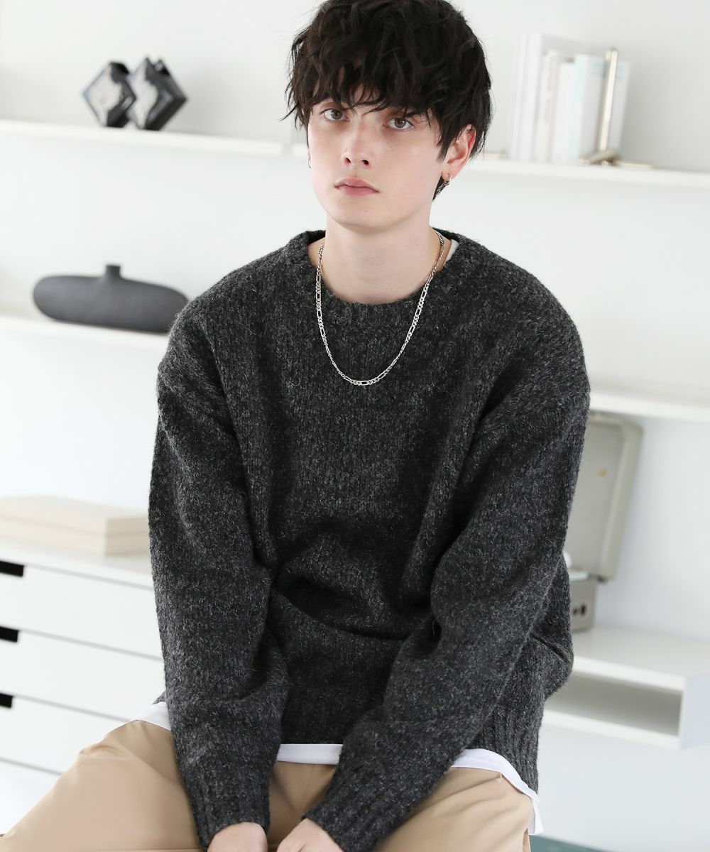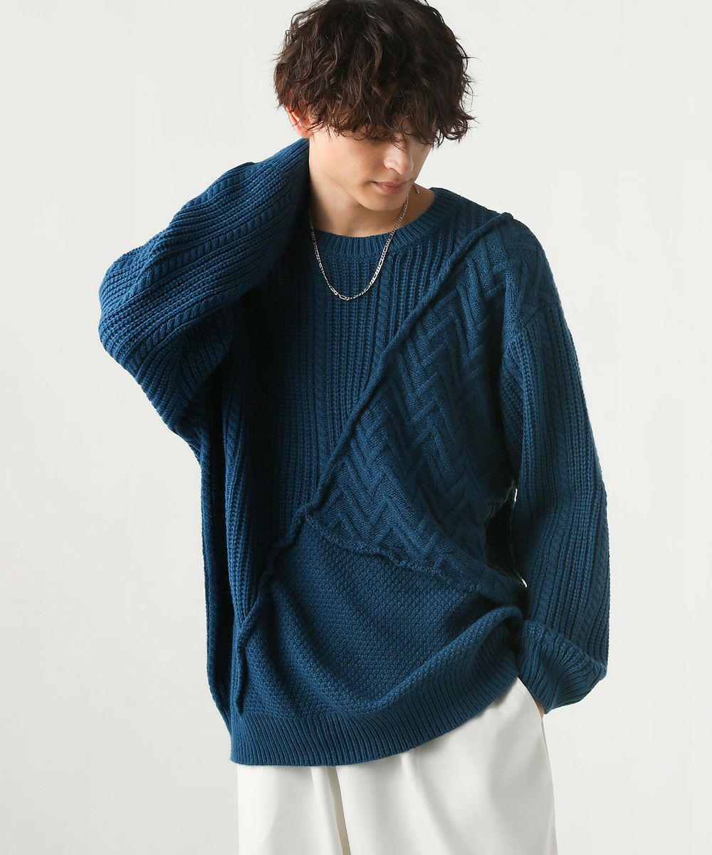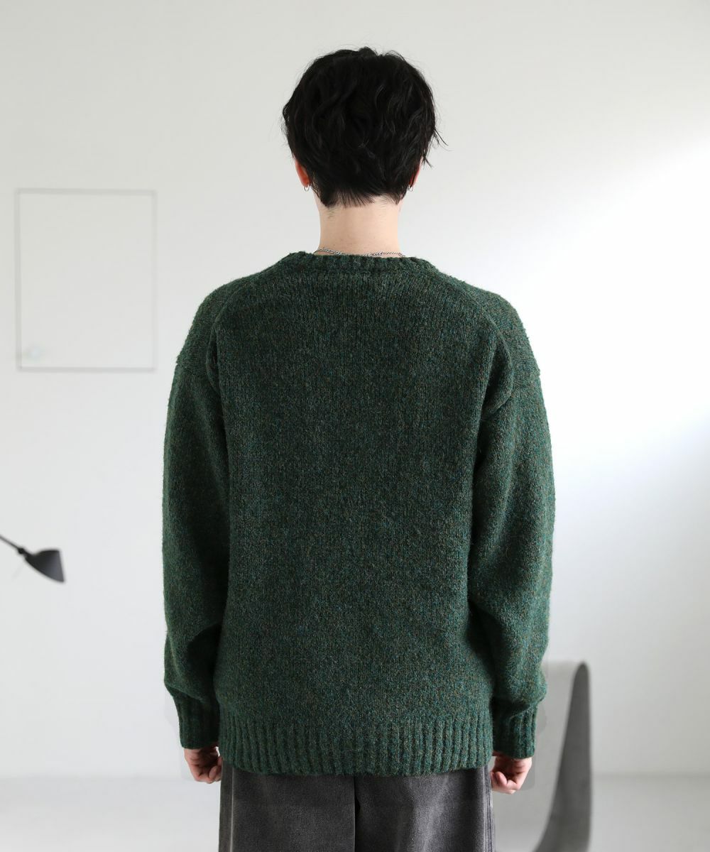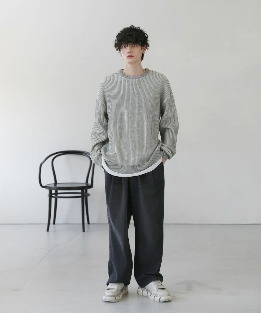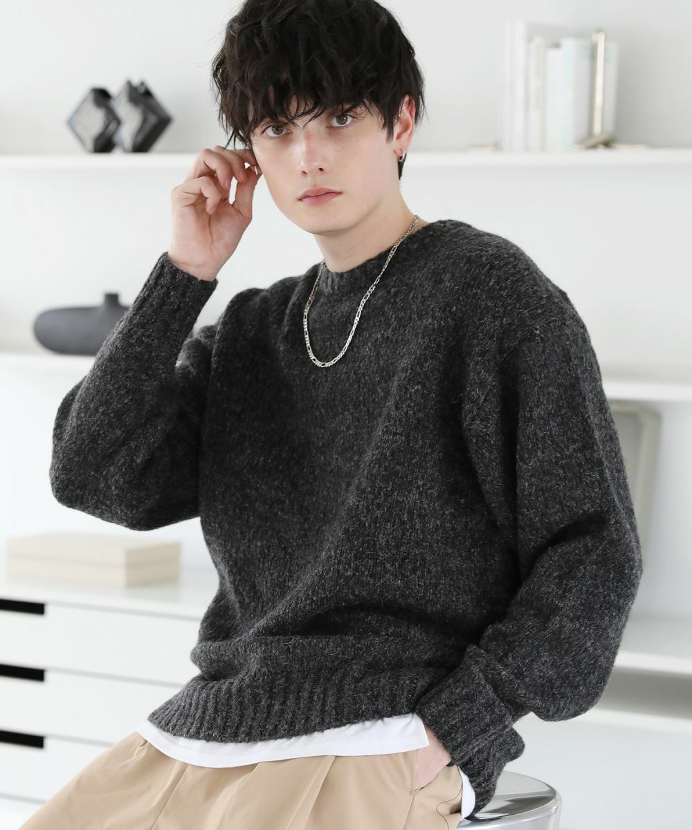 ビックシルエット配色ハンドステッチ長袖クルーネックニット