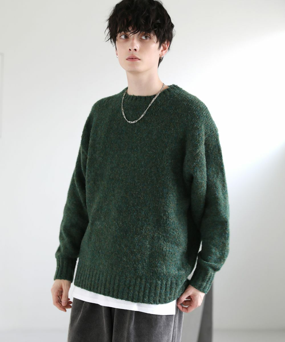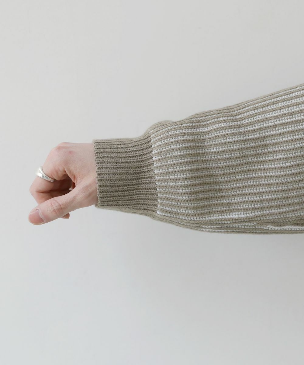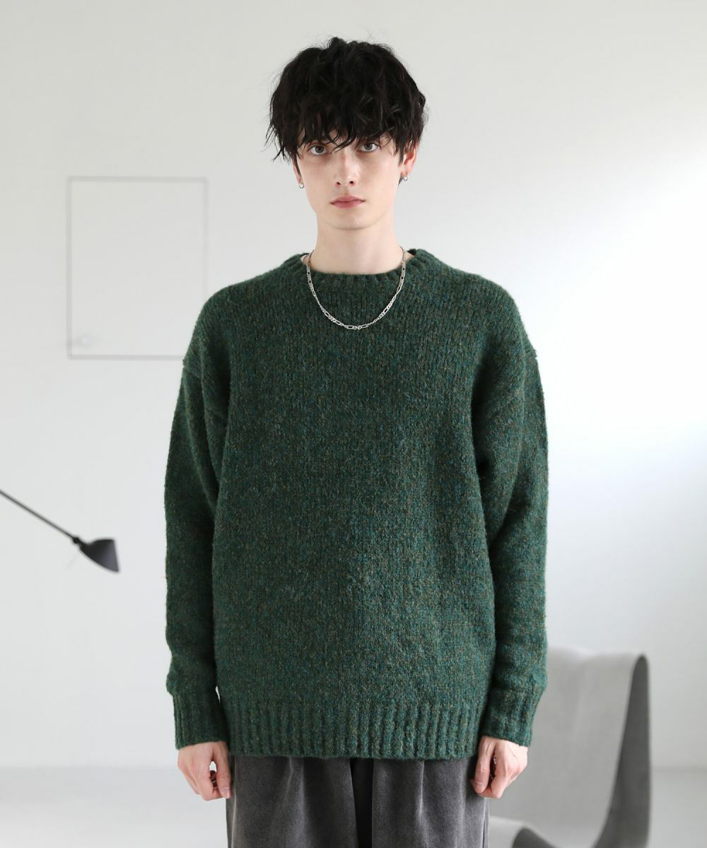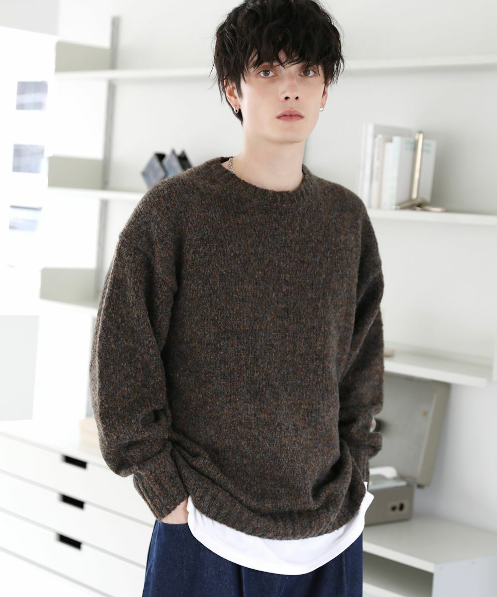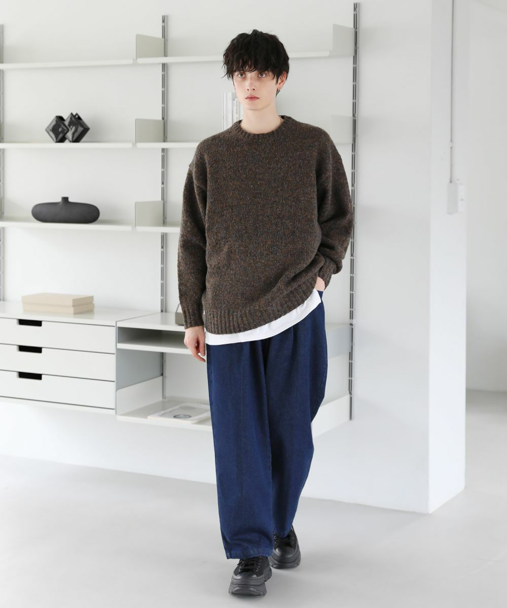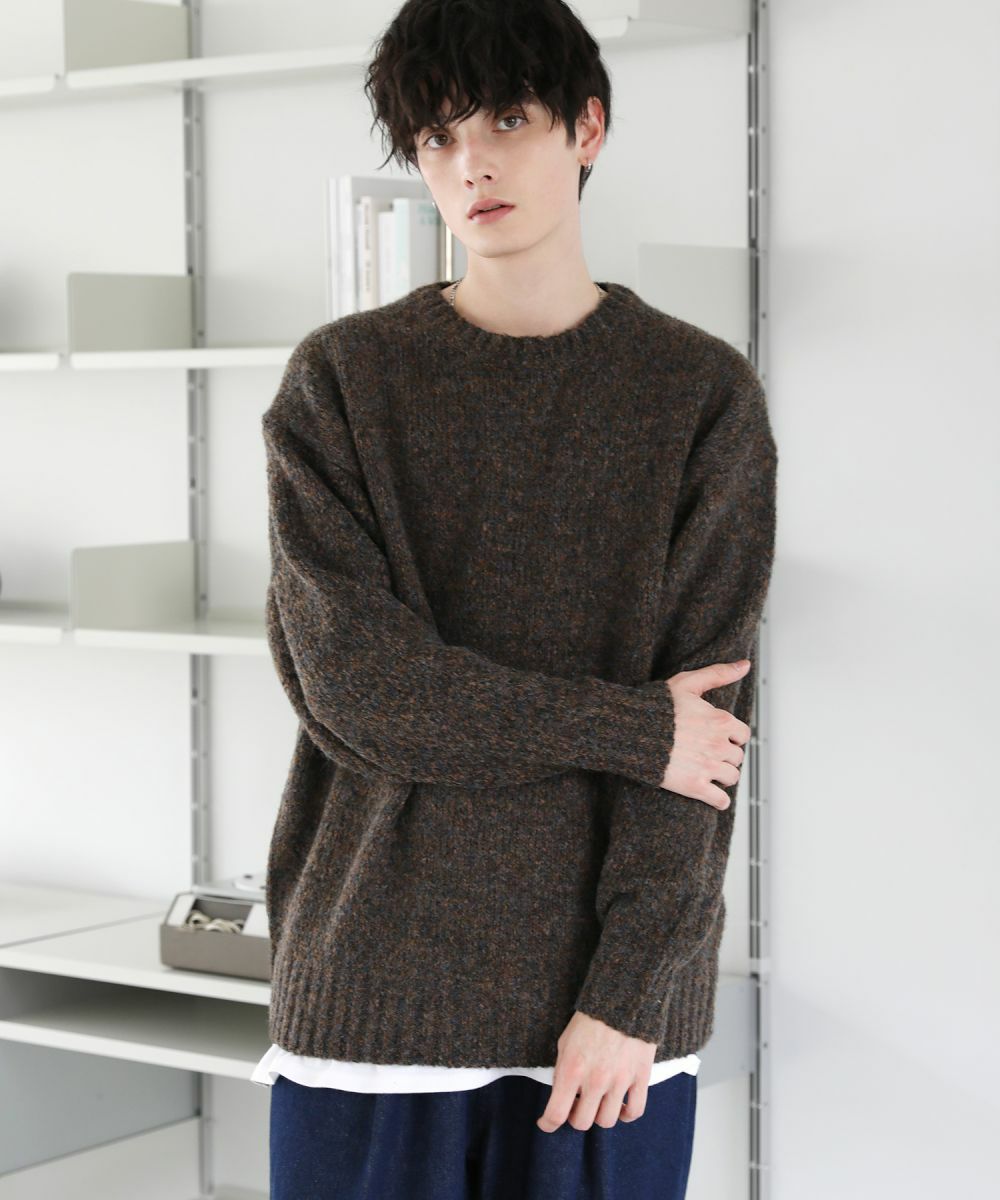 ビックシルエット配色ハンドステッチ長袖クルーネックニット