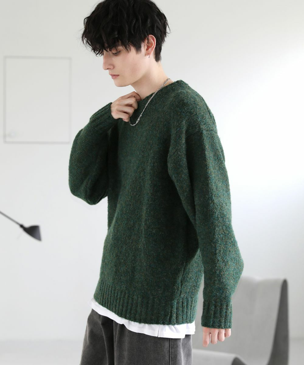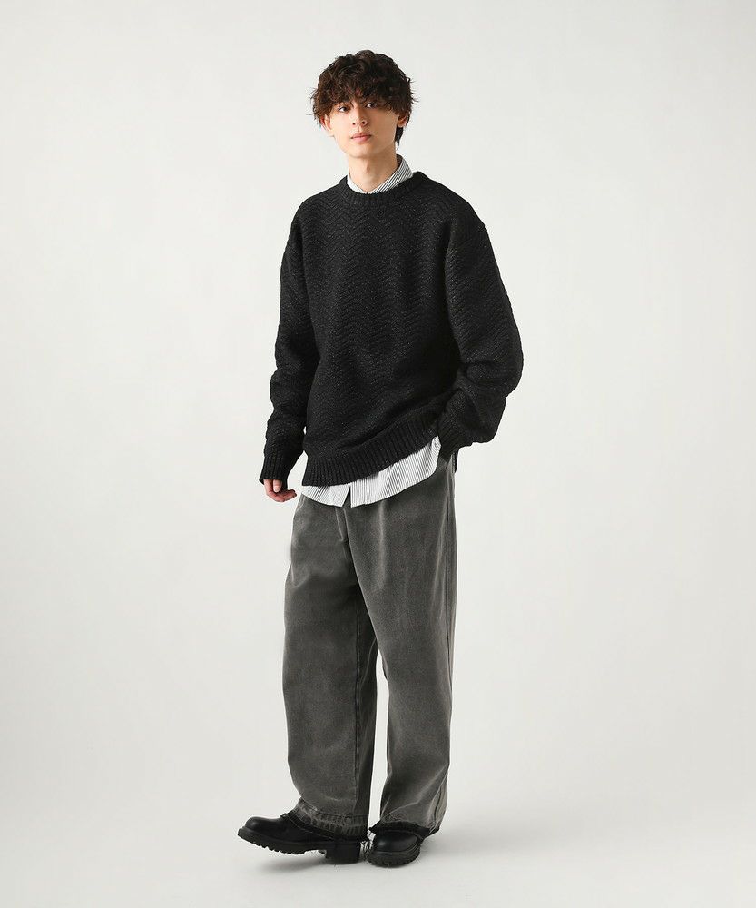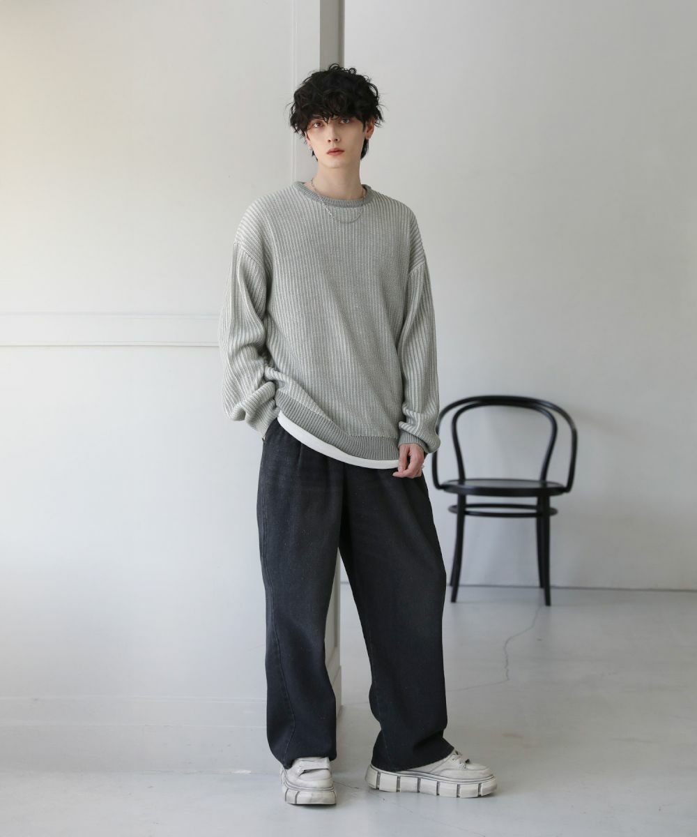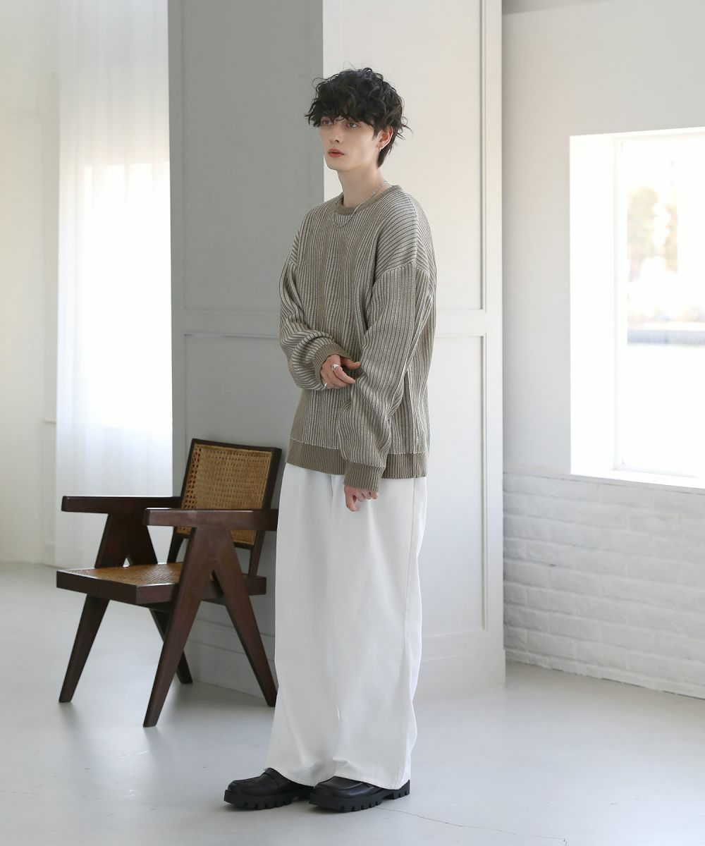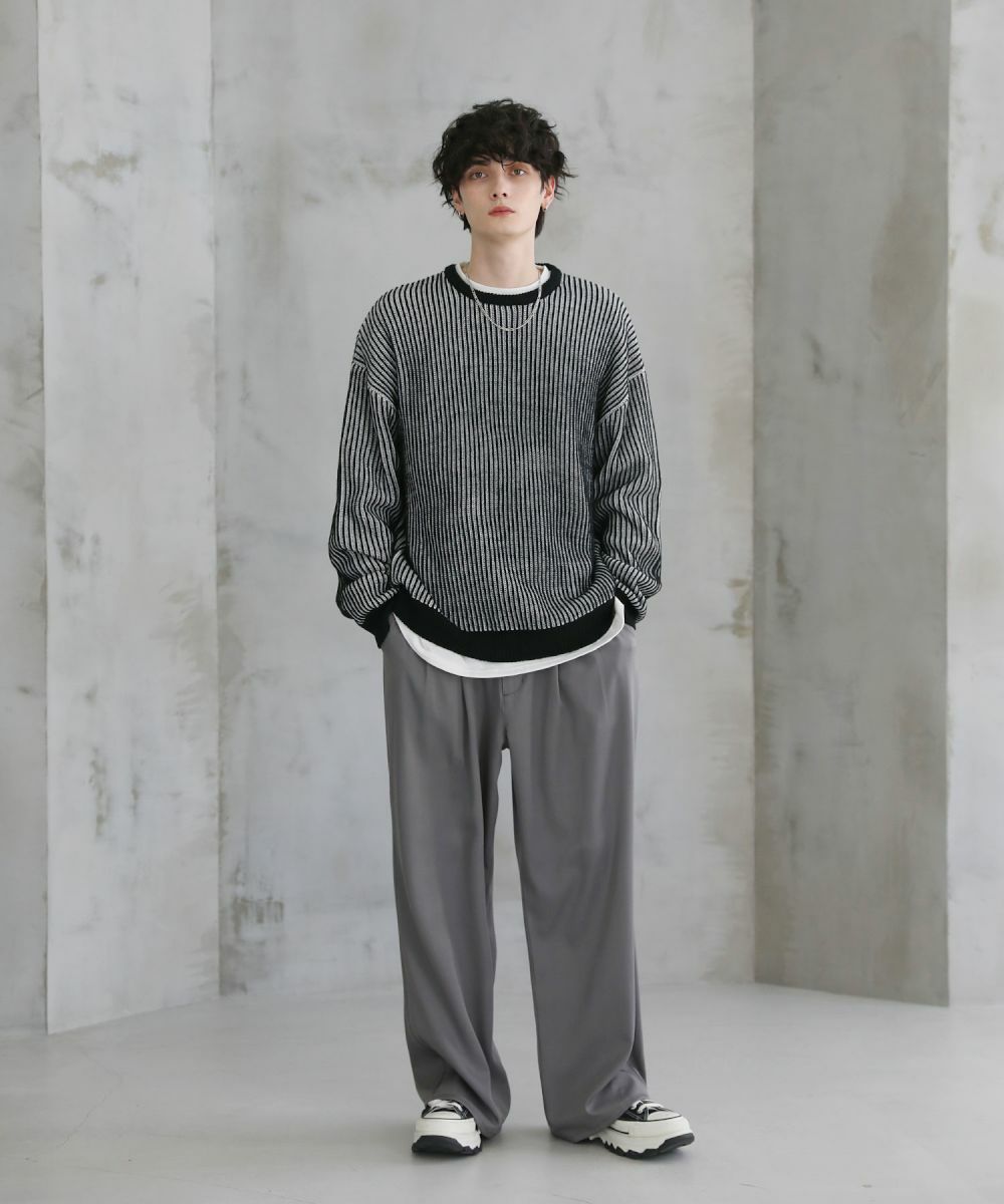 ビックシルエット配色ハンドステッチ長袖クルーネックニット