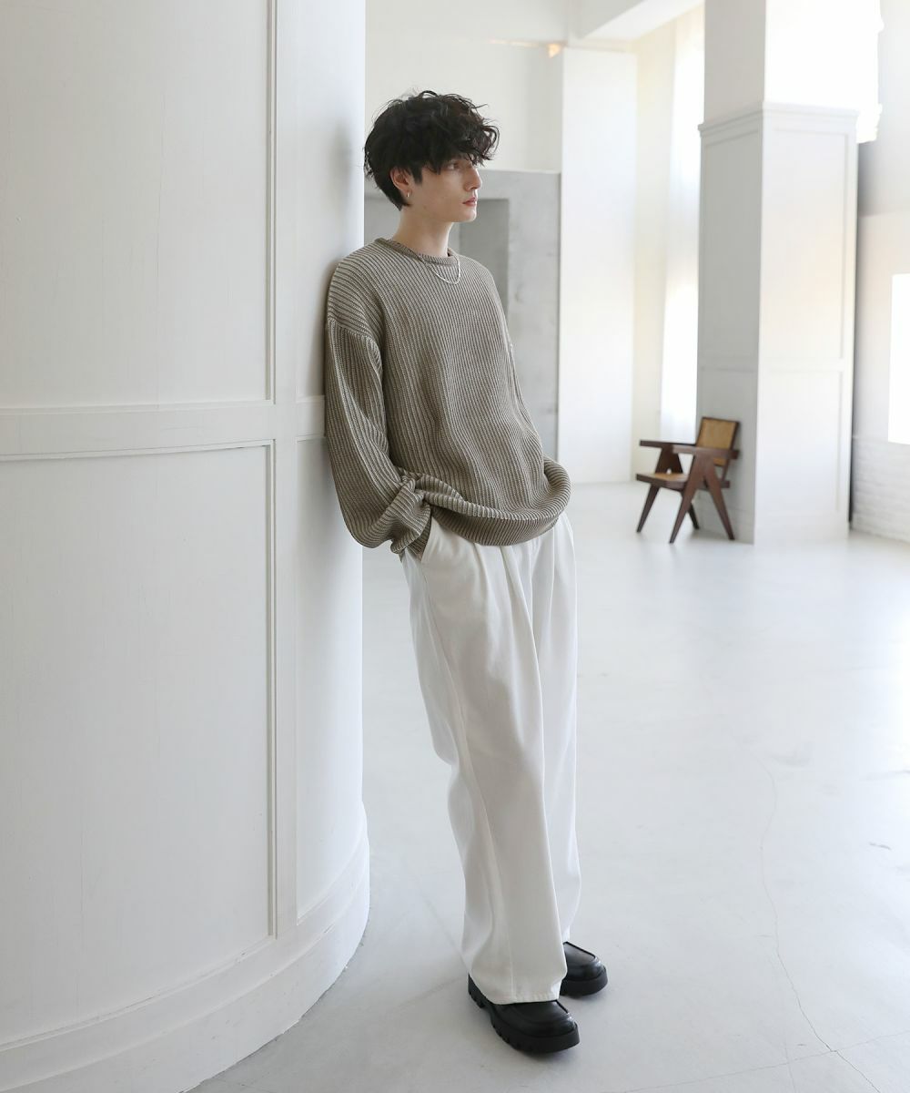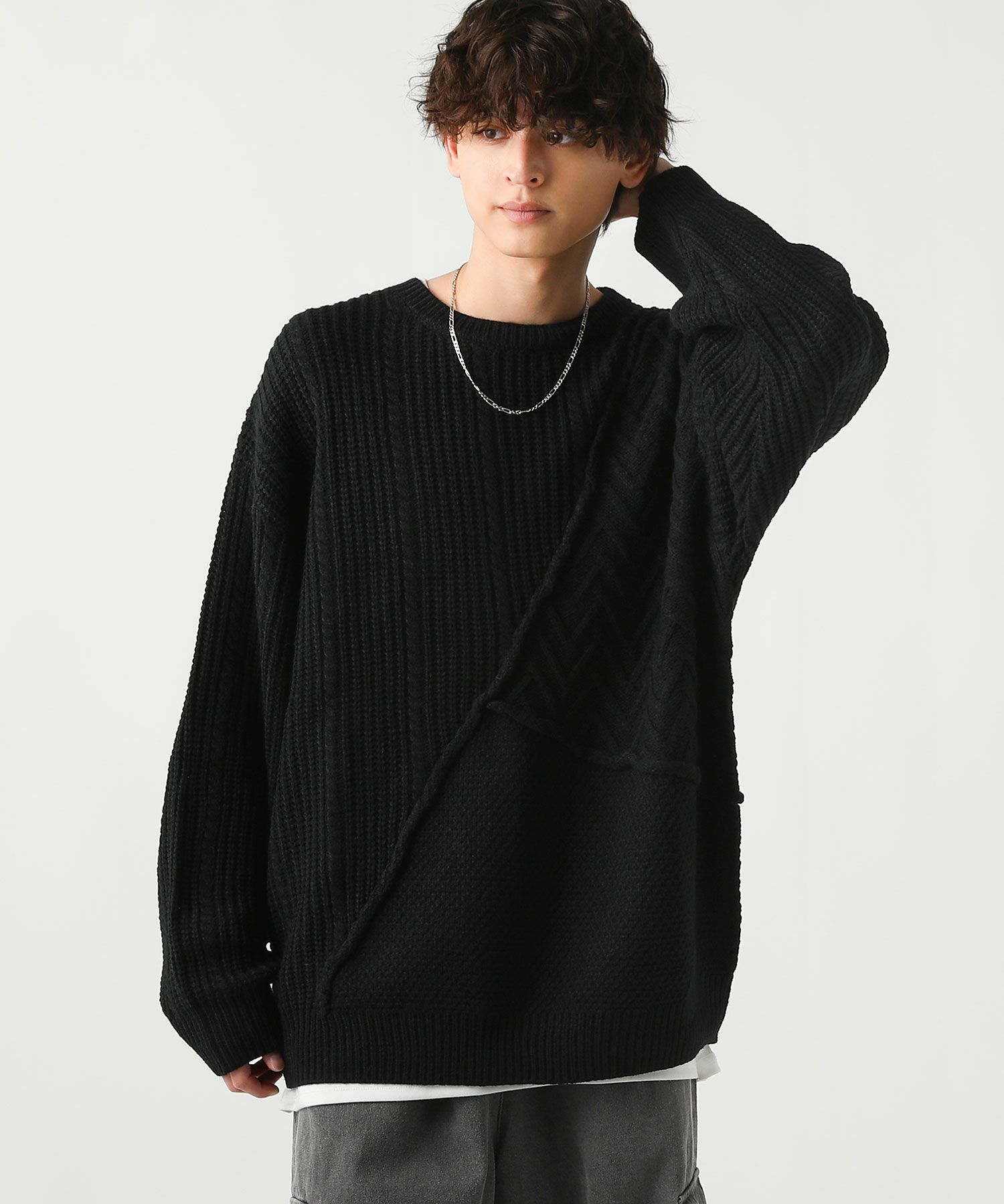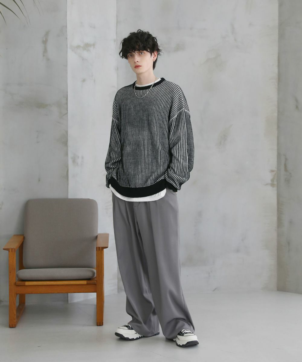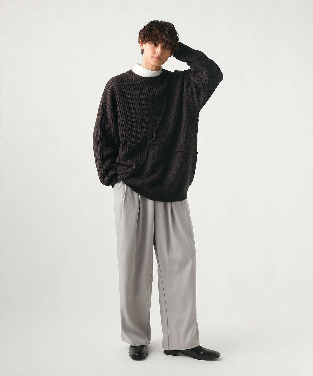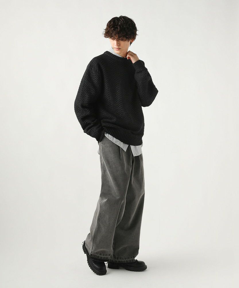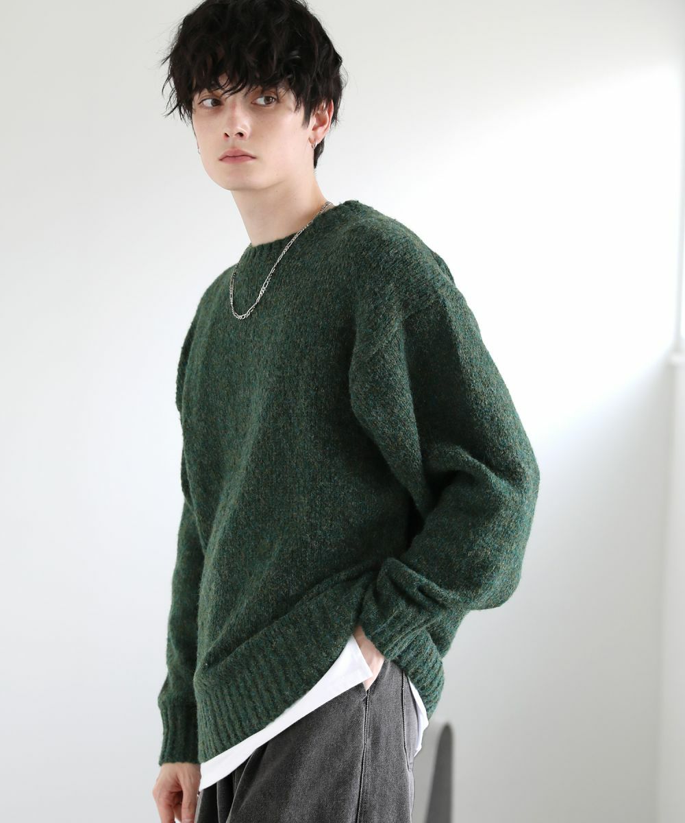 ビックシルエット配色ハンドステッチ長袖クルーネックニット