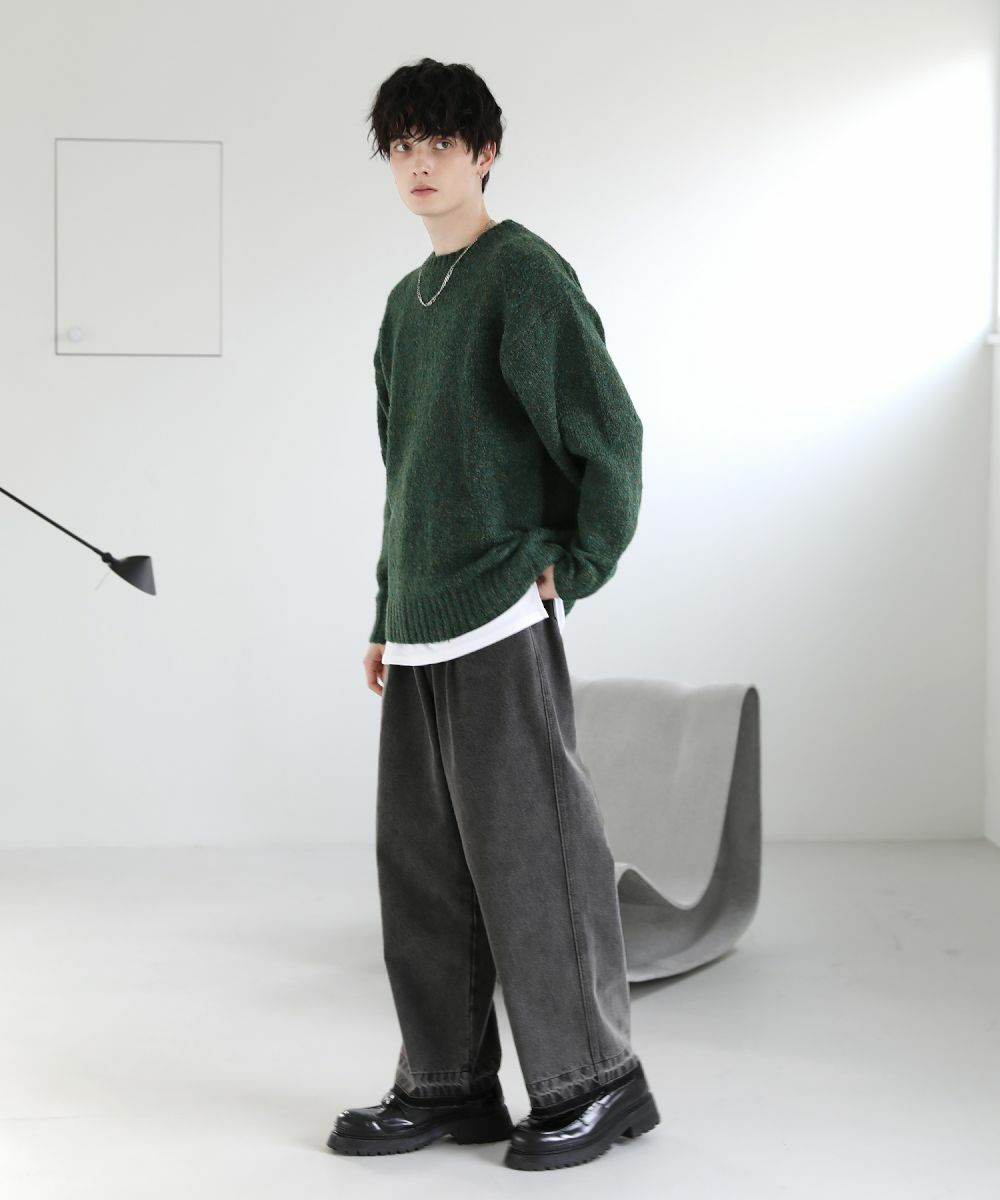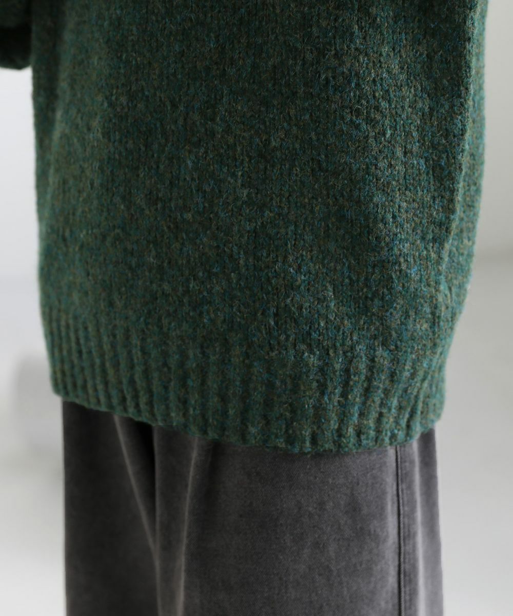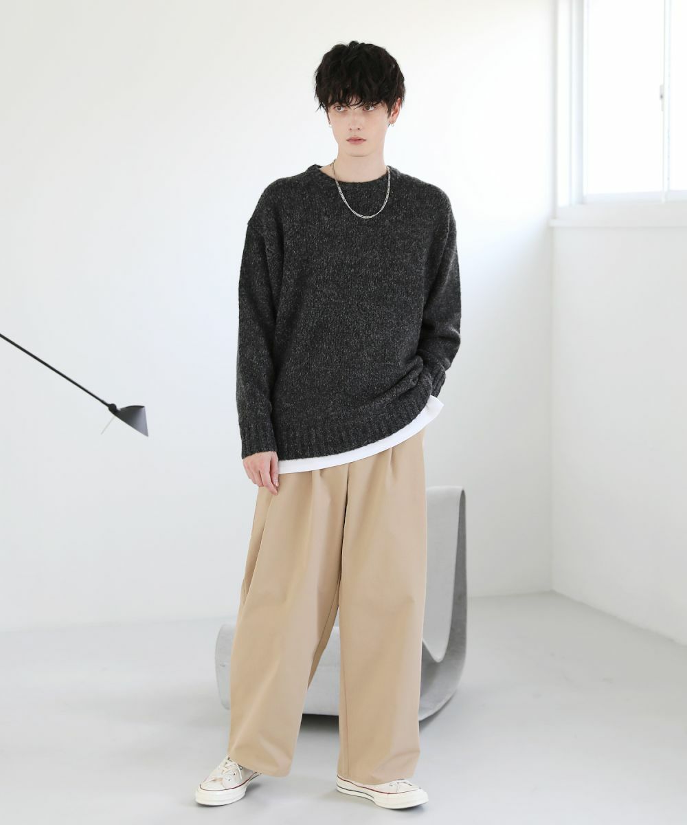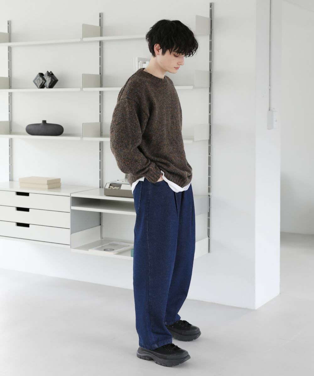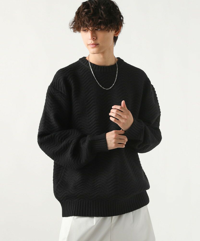 ビックシルエット配色ハンドステッチ長袖クルーネックニット