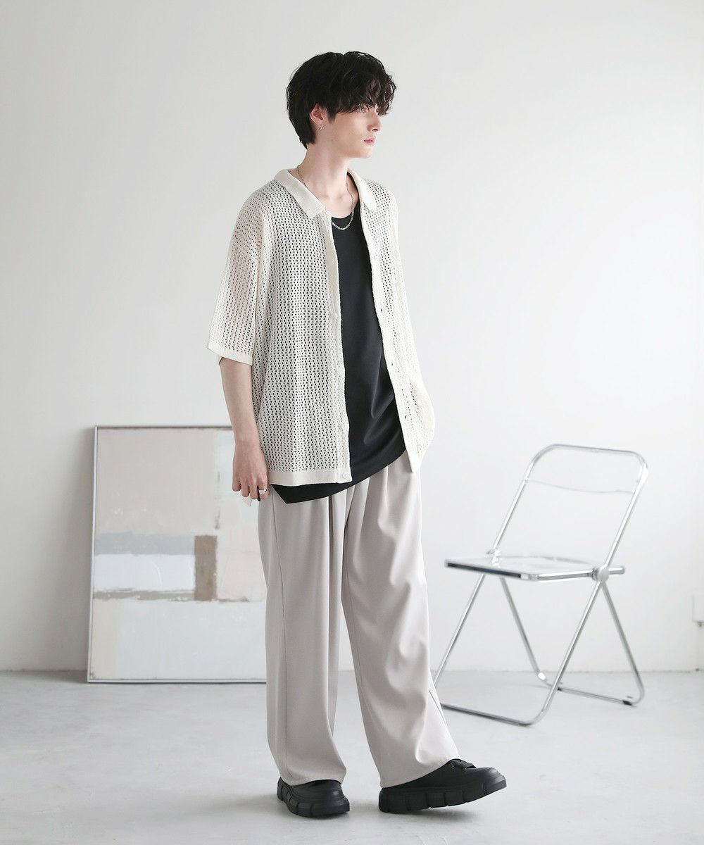 UVカット梨地オーバーサイズレギュラーカラー5分袖シャツ