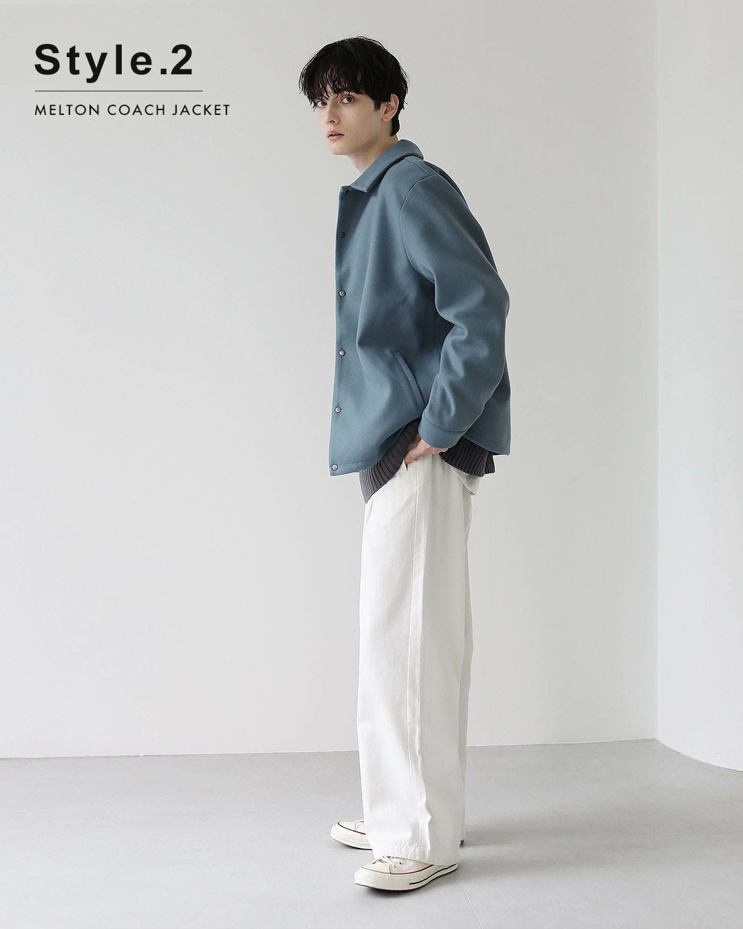 ストリート要素のあるコーチジャケットにメルトン生地を使用することでキレイめな雰囲気をプラス。着こなしに取り入れやすいくすみブルーはダークトーンにまとまりがちな冬の着こなしを新鮮に見せてくれます。