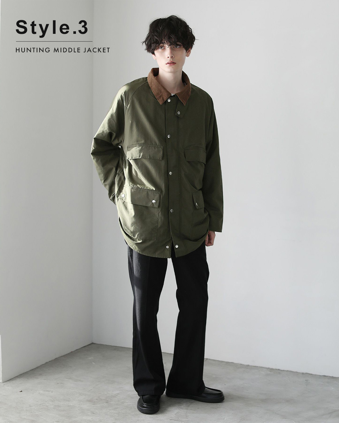 ヴィンテージのハンティングジャケットをベースに作られたオーバーサイズのミドル丈ジャケット。襟を立ててベルトを止めるとハイネックのデザインになり、雰囲気の違った着こなしを楽しめます。裏ボアで軽く暖かいアイテム。